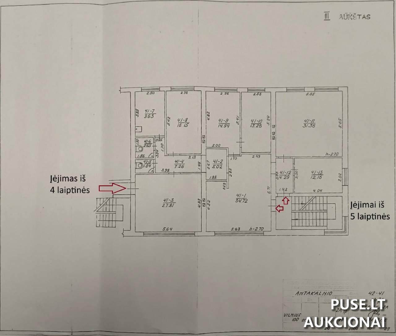 Negyvenamosios administracinės-komercinės patalpos, unikalu Nr. 1399-9007-4014:0044. Bendras plotas 181,09 kv. m., patalpų skaičius 8. Adresas: Antakalnio g. 42-41, Vilnius. Patalpos parduodamos su baldais. Pardavimo komplekte yra požeminis garažas Nr. 3 (unikalus Nr. 1399-9007-4014:0047), bendras garažo plotas 15,56 kv. m., adresas Antakalnio g. 42, Vilnius. Nuosavybės dalis 1/1. Pradinė pardavimo kaina 405 900 EUR. Garantinis mokestis 20 295 EUR.
