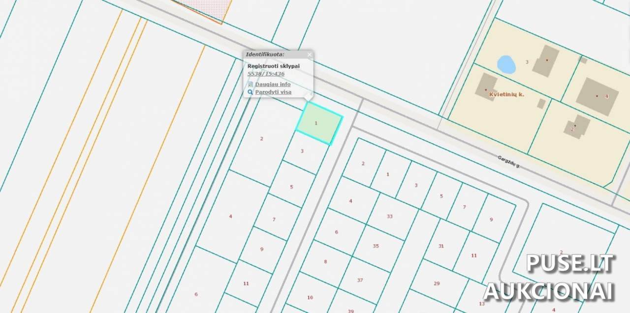 Parduodama 160/477 dalis žemės sklypo adresu Klaipėdos r. sav., Kvietinių k., Ąžuolų g. 1. Viena iš 57 išvaržomų žemės sklypų dalių. Pradinė pardavimo kaina 92 845 EUR. Sklypai suformuoti atliekant kadastrinius matavimus. Daugumos (54 vnt.) sklypų pagrindinė naudojimo paskirtis – gyvenamosios teritorijos (mažaaukščių gyvenamųjų namų statybos), taip pat yra sklypų susisiekimo ir inžinerinių komunikacijų aptarnavimui, komercinei paskirčiai ir bendrojo naudojimo teritorijai. Turto areštas įrašytas kaip apribojimas.
