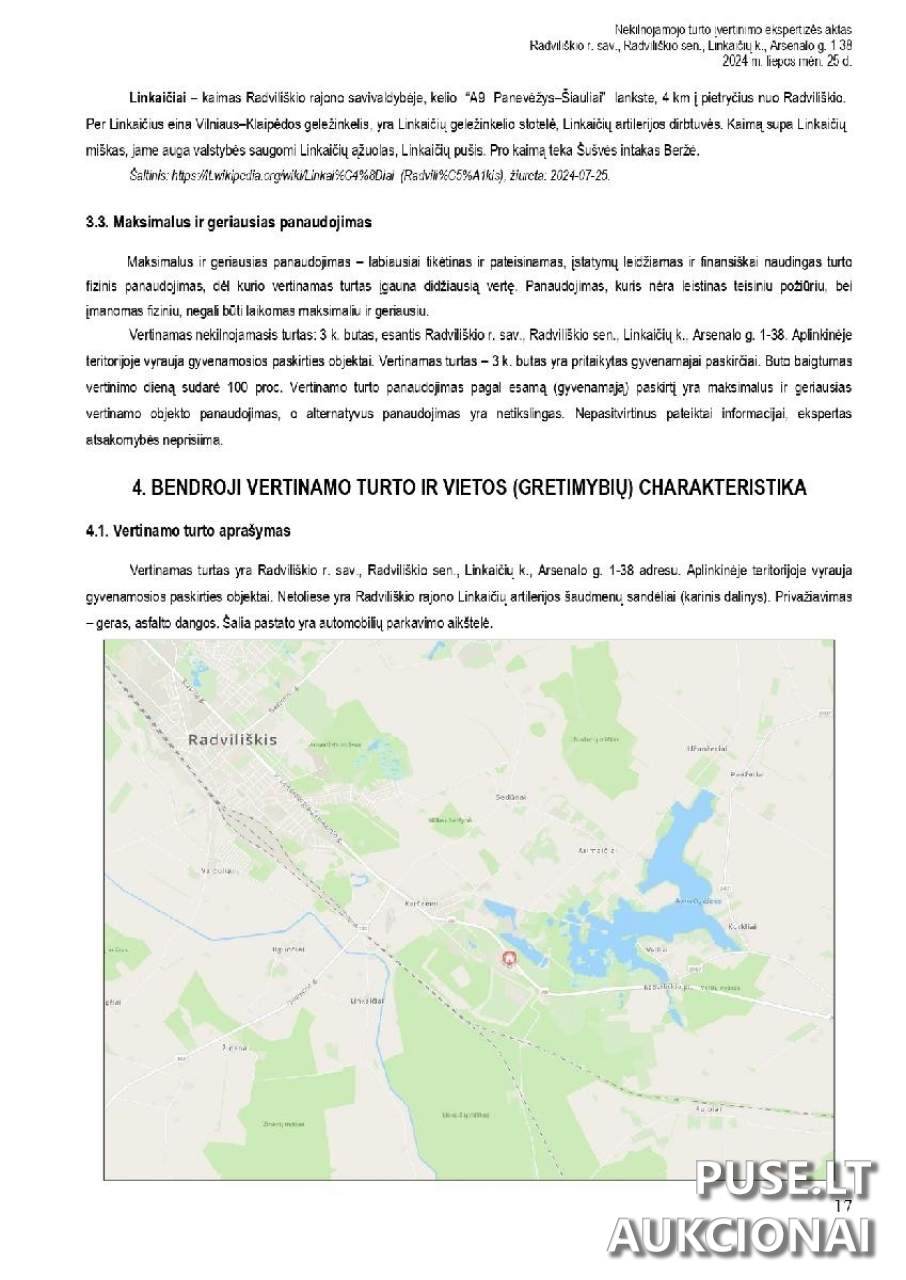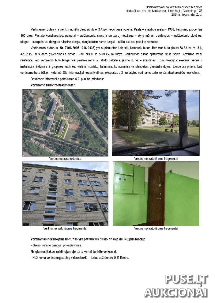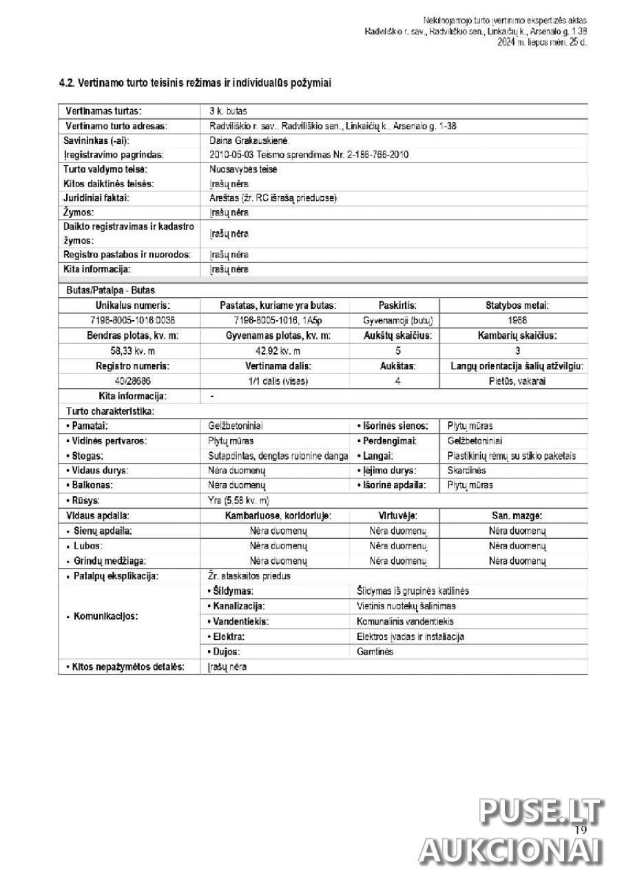 Parduodamas 3 kambarių butas Linkaičių kaime (Radviliškio r. sav.), Arsenalo g. 1. Butas yra 4 aukšte, bendras plotas 58,33 m² (naudinga ir gyvenamasis plotas atitinkamai 58,33 m² ir 42,92 m²). Priklauso rūsys (5,58 m²). Pastatas užbaigtas 1968 m., baigtumo procentas 100 %. Šildymas - grupinė katilinė, vandentiekis - komunalinis, nuotekų šalinimas - vietinis, dujos - natūralios, viryklė - dujinė. Parduodama dalis: 1/1. Unikalus daikto numeris: 7196-8005-1016:0038. Pradinė aukciono kaina: 8 179 EUR. Apribojimai: disponavimo teisės apribojimas; turto areštas. Dokumentuose pateikta VĮ Registrų centro informacija.