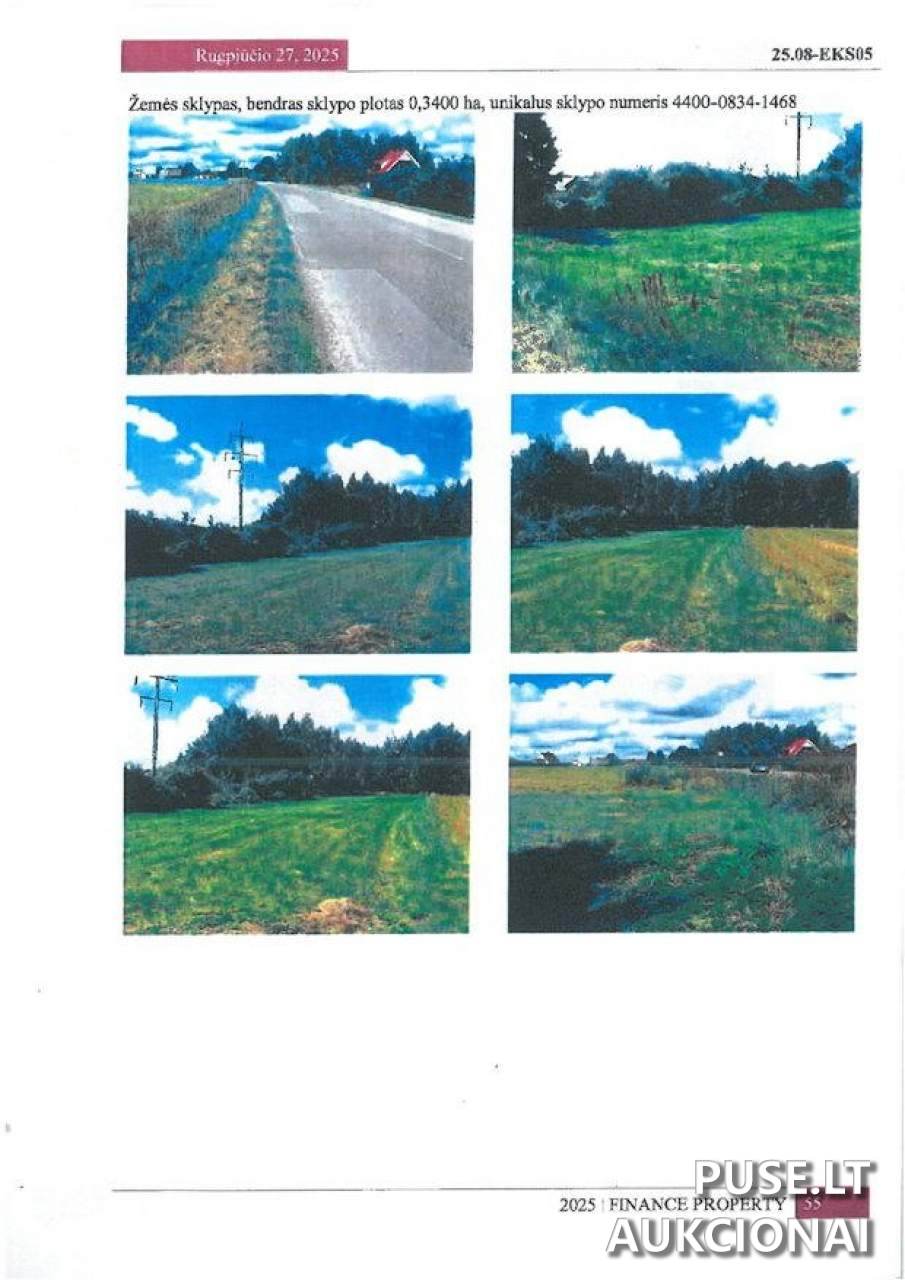 Parduodama 6/119 dalis žemės ūkio paskirties sklypo Dusinėnų k., Juodšilių sen., Vilniaus r. sav. Sklypas registruotas unikaliu numeriu 4400-0834-1468, kadastriniu numeriu 4177/0100:493 (Rudaminos k.v.). Dokumentuose pateikiami skirtingi ploto duomenys: bendras plotas minima 0,3000 ha, detalesnėse charakteristikose nurodytas sklypo plotas 0,3400 ha; žemės ūkio naudmenų plotas 0,3400 ha (ariamos žemės dalis). Daikto pagrindinė naudojimo paskirtis: žemės ūkio; žemės sklypo naudojimo būdas: kiti žemės ūkio paskirties sklypai. Žemės ūkio naudmenų našumo balas: 45,0. Matavimų tipas: sklypas suformuotas atliekant preliminarius matavimus. Sklypas yra apie 18 km į pietus nuo Vilniaus centro, Dusinėnų kaime, šalia Dusinėnų gatvės; privažiavimas – asfaltuota Dusinėnų gatvė. Pardavimo metu galioja turto areštas. Pradinė aukciono kaina: 268 EUR. Parduodama dalis: 6/119.