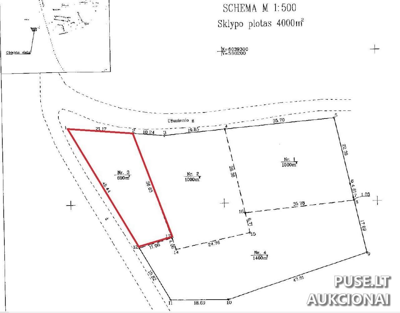 Parduodama dalis žemės sklypo (3/20). Pagrindinė naudojimo paskirtis: žemės ūkio. Naudojimo būdas: kiti žemės ūkio paskirties žemės sklypai. Bendras žemės sklypo plotas: 0,4000 ha. Iš jo pievų ir natūralių ganyklų plotas: 0,4000 ha. Žemės ūkio naudmenų našumo balas: 29.0. Matavimų tipas: žemės sklypas suformuotas atliekant kadastrinius matavimus. Skolininkas atskirai valdo, naudojasi ir disponuoja 600/4000 dalimi 4000 kv. m ploto žemės sklypo; plane pažymėta indeksu "3/600" ir linijomis bei skaičiais: 1-2-13-12-1. Pradinė pardavimo kaina: 560 EUR. Apribojimai: disponavimo teisės apribojimas, turto areštas. Kadastrinis nr.: 4154/2900:168. Unikalus nr.: 4400-1127-4885.