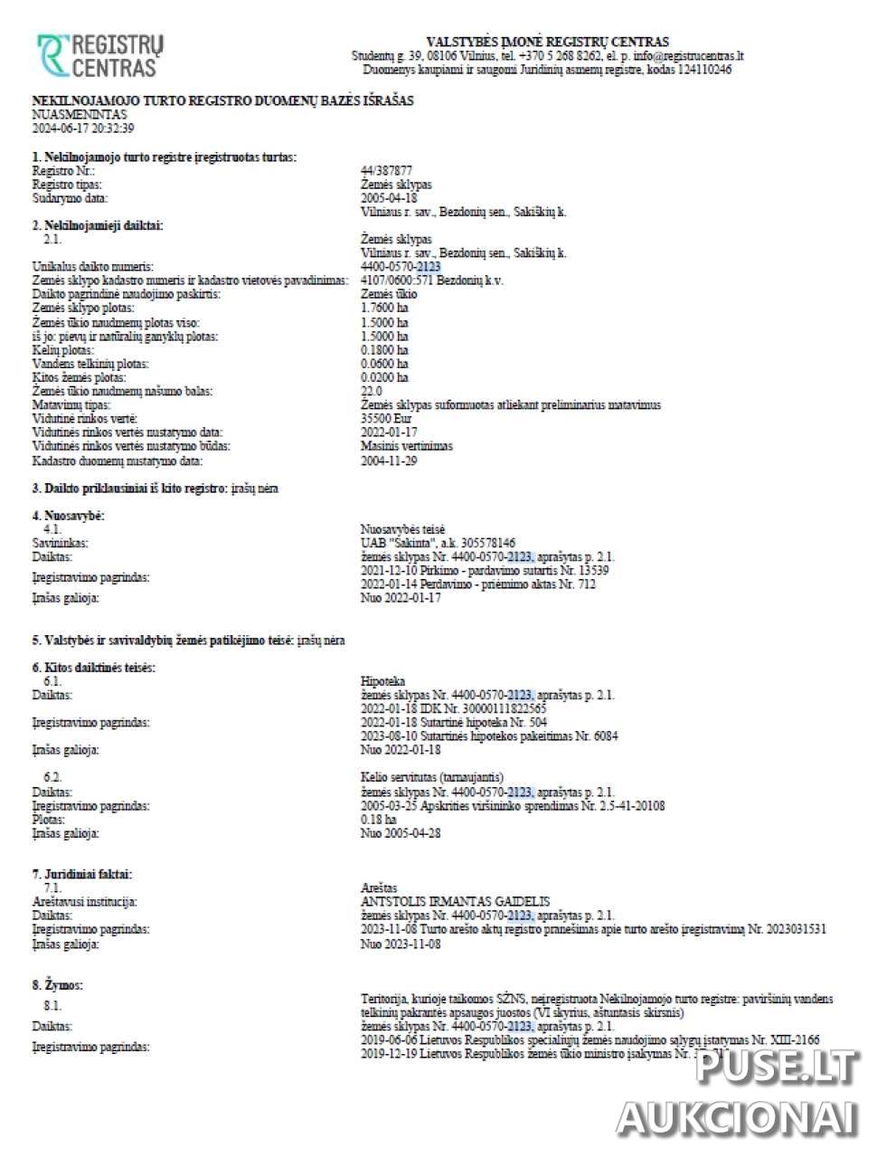 Parduodamas žemės sklypas Sakiškių k., Vilniaus r. (kadastrinis nr. 4107/0600:571, unik. nr. 4400-0570-2123). Sklypo paskirtis: žemės ūkio. Pardavimo dalis 1/1. Pradinė kaina 112500 EUR. PVM objektas: Taip. Statusas: vykstančios varžytynės pagal nemokumo administratorių procedūrą. Apribojimai: įkeistas turtas. Savininkas: UAB "Sakinta" (305578146).