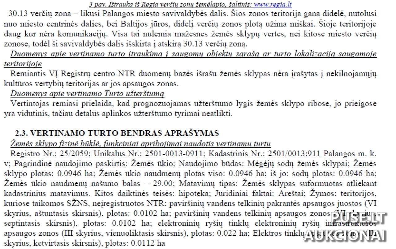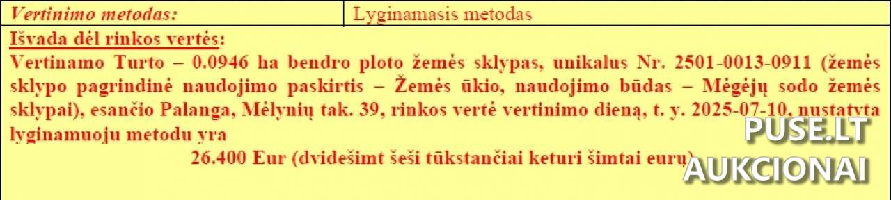 Vykstančios antstolių varžytynės: žemės sklypas Palangos m., Mėlynių tak. 39. Pradinė kaina 21 120 EUR. Pardavimo dalis 1/1. Kadastrinis nr. 2501/0013:911, unikalus nr. 2501-0013-0911. Sklypo plotas 0.0946 ha. Paskirtis - mėgėjų sodo žemės sklypai; sodų plotas 0.0946 ha. Žemės ūkio naudmenų našumo balas 29.0. Matavimų tipas: sklypas suformuotas atliekant kadastrinius matavimus. Turtas yra areštuotas. Visos pardavimo sąlygos ir specifiniai reikalavimai pateikti aukciono dokumentuose.