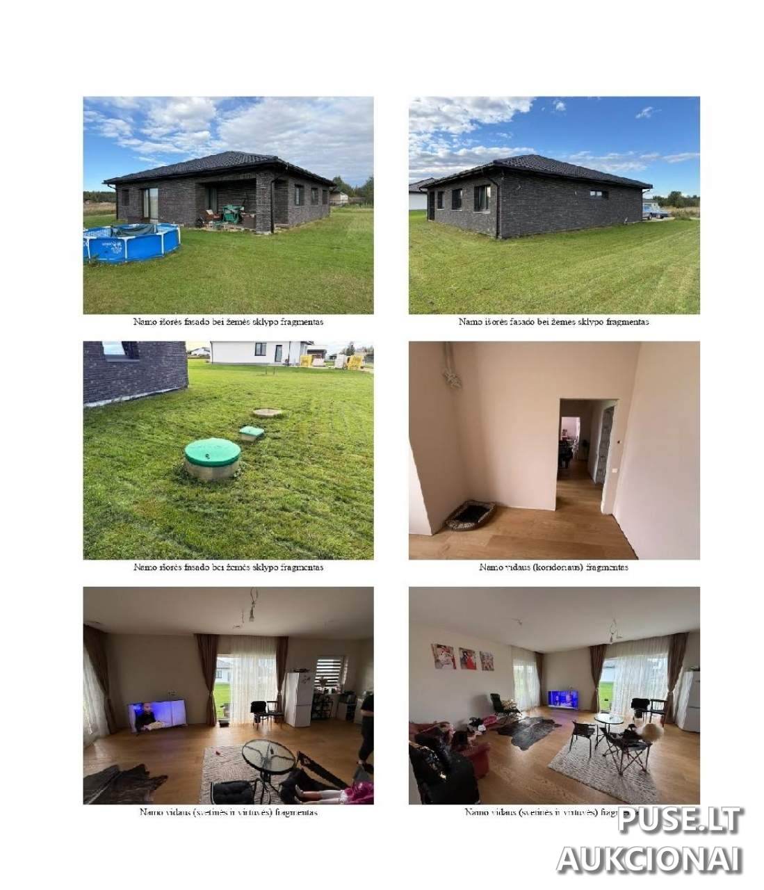 Parduodamas gyvenamas vieno aukšto namas su garažu Vilniaus r. sav., Akalotės k., Akalotės g. 34. Pradinė kaina 215 200 EUR. Namą sudaro bendras plotas 140.84 m² (pagal kadastrinius matavimus 137.18 m²), užstatytas plotas 191 m². Unikalus NR.: 4400-5491-7047. Statybos metai 2020–2023, sienų medžiaga blokeliai, stogo danga metalas. Paskirties grupė: vienbučiai ir dvibučiai, pagrindinė naudojimo paskirtis – vienbučiai. Namas baigiamas įrengti; faktinis baigtumas vertinimo dieną 98% (RC registro duomenyse įregistruotas 85%). Energijos naudingumo klasė A++. Šildymas: grindinis šildymas, įrengtas katilas. Vandentiekis ir kanalizacija: vietiniai. Vėdinimas įrengtas. Dujos ir viryklė nėra. Elektra yra. Vidaus apdaila: vinilinė danga ir plytelės grindims, dažytos sienos, įtempiamos lubos; vidaus durys kol kas nerengtos; langai – plastikiniai su stiklo paketais; įėjimo durys – plastikinės su stiklu. Turto konstruktyvas: gelžbetoniniai pamatai, blokelių sienos, medinė perdanga, šlaitinė stogo konstrukcija. Parduodama dalis: 1/1. Dokumentinė būklė: registruose nurodyti unikalūs NR. ir pastato duomenys; objekto kadastriniai pokyčiai neužregistruoti. Parduodama vykstant antstolių varžytynėms. Apribojimai: hipotekos nutartis, turto areštas. Aukciono pradžia: 2025-10-28 09:00:29, pabaiga: 2025-11-27 09:00:59.