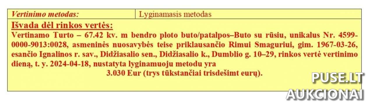 Parduodamas 3 kambarių butas (bendras plotas 67,42 kv. m) su rūsiu (9,50 kv. m) adresu Ignalinos r. sav., Didžiasalio k., Dumblio g. 10-29. Butas yra apleistas ir nenaudojamas (netinkamas naudoti): karštas ir šaltas vanduo atjungti, išlikęs senas tualetas ir vonia, yra šildymo radiatoriai. Parduodama 1/1 dalis. Objektą veikia disponavimo teisės apribojimas ir turto areštas, todėl pirkėjui reikalingas susipažinimas su apribojimais prieš dalyvaujant aukcione. Unikalus numeris: 4599-0000-9013:0028.