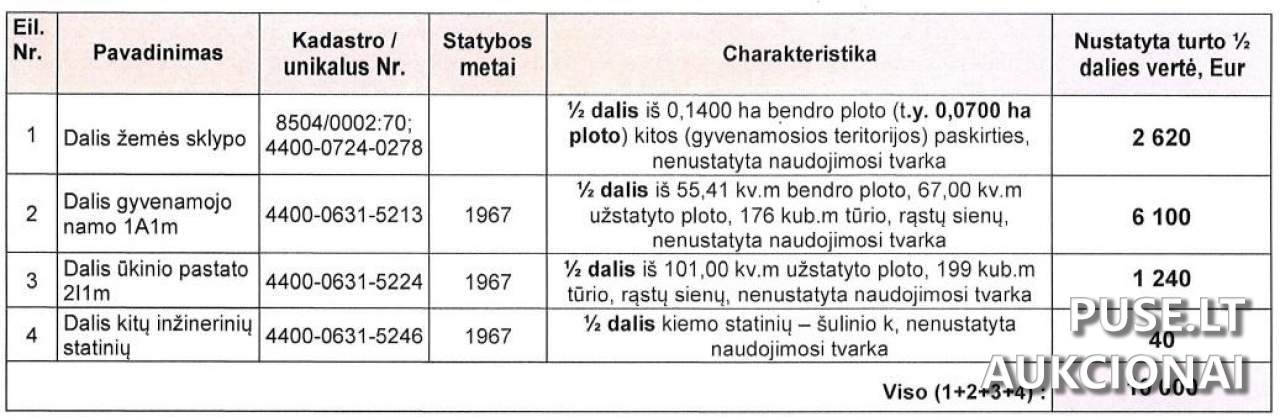 Parduodama 1/2 dalis 0,14 ha ploto žemės sklypo, kitos paskirties (naudojimo būdas - gyvenamosios teritorijos, naudojimo pobūdis - mažaaukščių gyvenamųjų namų statybos). Sklypas netaisyklingo stačiakampio formos, beveik lygios reljefo, apsodintas vaismedžiais ir vaiskrūmiais, neaptvertas. Šiaurinėje sklypo dalyje stovi gyvenamasis namas, į pietus nuo jo - ūkinis pastatas ir kiemo statiniai. Sklypas suformuotas atliekant preliminarius matavimus. Aplinkoje - gyvenamųjų namų valdos, Beržės upelis, neužstatyti žemės ūkio paskirties sklypai. Naudojimosi tvarka nėra nustatyta. Kadastrinis nr.: 8504/0002:70. Unikalus nr.: 4400-0724-0278. Apribojimai: disponavimo teisės apribojimas, turto areštas.