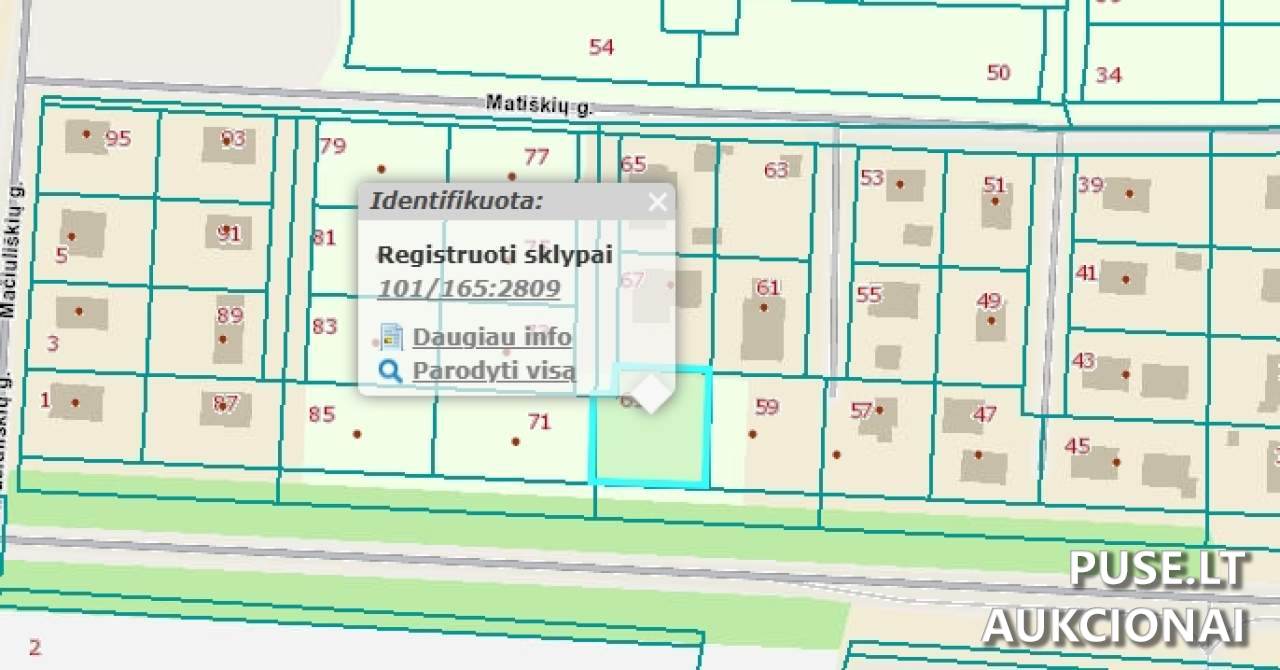 Parduodamas 0,1021 ha ploto žemės sklypas Vilniaus mieste, adresu Matiškių g. 69, Vilniaus m. savivaldybėje, per antstolių varžytynes. Šio gyvenamosios paskirties sklypo naudojimo būdas yra nustatytas kaip vienbučių ir dvibučių gyvenamųjų pastatų teritorijos. Sklypas yra suformuotas padalijimo būdu. Kadastrinis numeris 0101/0165:2809, unikalus numeris 4400-5997-6688. Visos 1/1 dalys parduodamos. Tai puiki investavimo galimybė formuoti nuosavą būstą ar plėtoti projektą gyvenamųjų pastatų zonoje Vilniaus rajone.