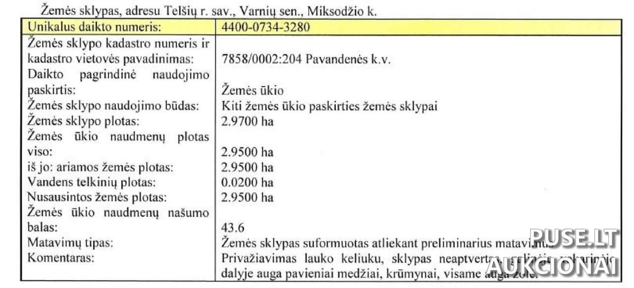 Parduodamas 1/1 dalies žemės sklypas Telšių rajono savivaldybėje, Miksodžio kaimo vietovėje, antstolių varžytynių būdu. Šis žemės sklypas yra parduodamas vykstančiose varžytynėse, o pradinė kaina siekia 4000 EUR. Nekilnojamojo turto identifikavimas yra suformuotas pagal kadastro numerį 7858/0002:204 ir unikalų numerį 4400-0734-3280. Turto aprašymas ir detalesnė informacija pateikiami vizualiuose dokumentuose, kuriuos privaloma peržiūrėti.