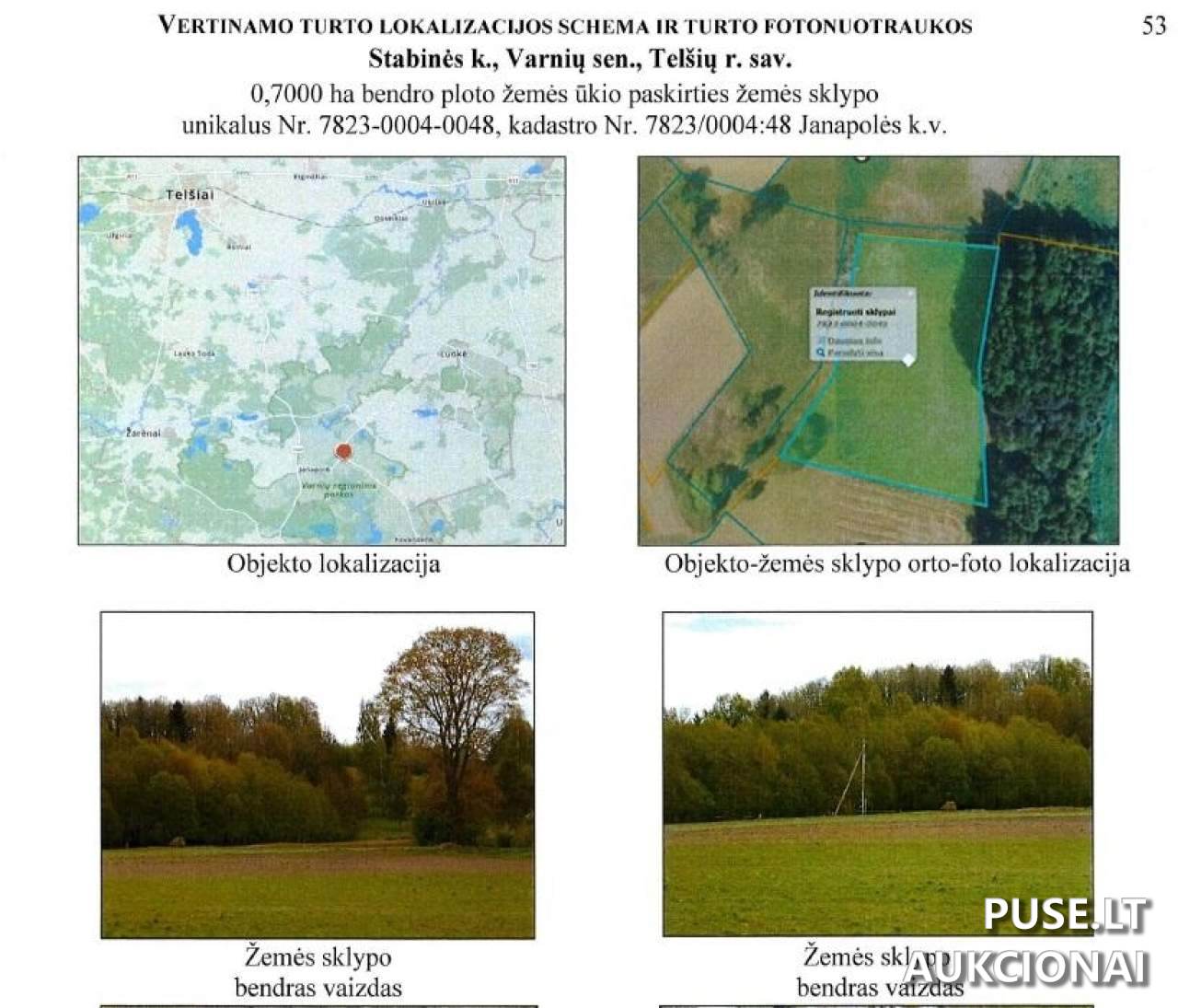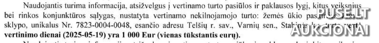 Viešame antstolių varžytynių aukcione parduodamas 1/1 dalies žemės sklypas, esantis Telšių rajono savivaldybėje, Stabinės kaime. Šis NT objektas yra tipas PIRMOSIOS - Sklypai ir jau vyksta šiuo metu. Kaina pradinė kaina sudaro 800 EUR. Aukcionas prasidėjo 2025-12-09 10:26:55 ir baigsis 2026-01-08 10:26:59. Sklypo unikalius numeris yra 7823-0004-0048, o kadastrinis numeris 7823/0004:48. Šiuo metu turtas yra areštuotas.