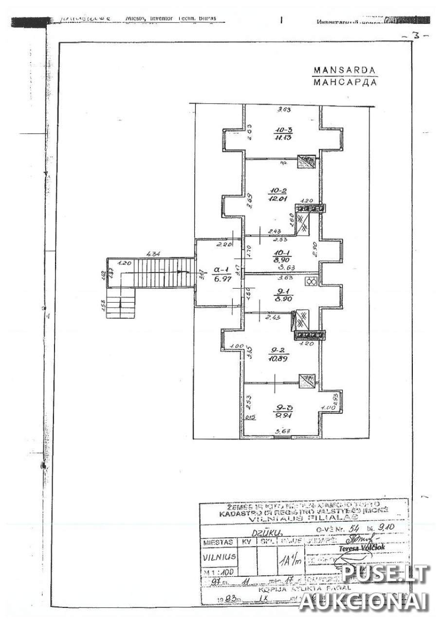 Parduodamas 1/1 dalies butas Vilniaus mieste, Dzūkų gatvėje 54-10, savivaldybės pakartotiniame aukcione, kurio pradinė kaina siekia 34037 EUR. Šis nekilnojamasis turtas yra 32,04 kv. m ploto, esantis vieno aukšto medinio pastato mansardoje. Mažame bute taip pat yra 3,69 kv. m bendrojo naudojimo patalpos.