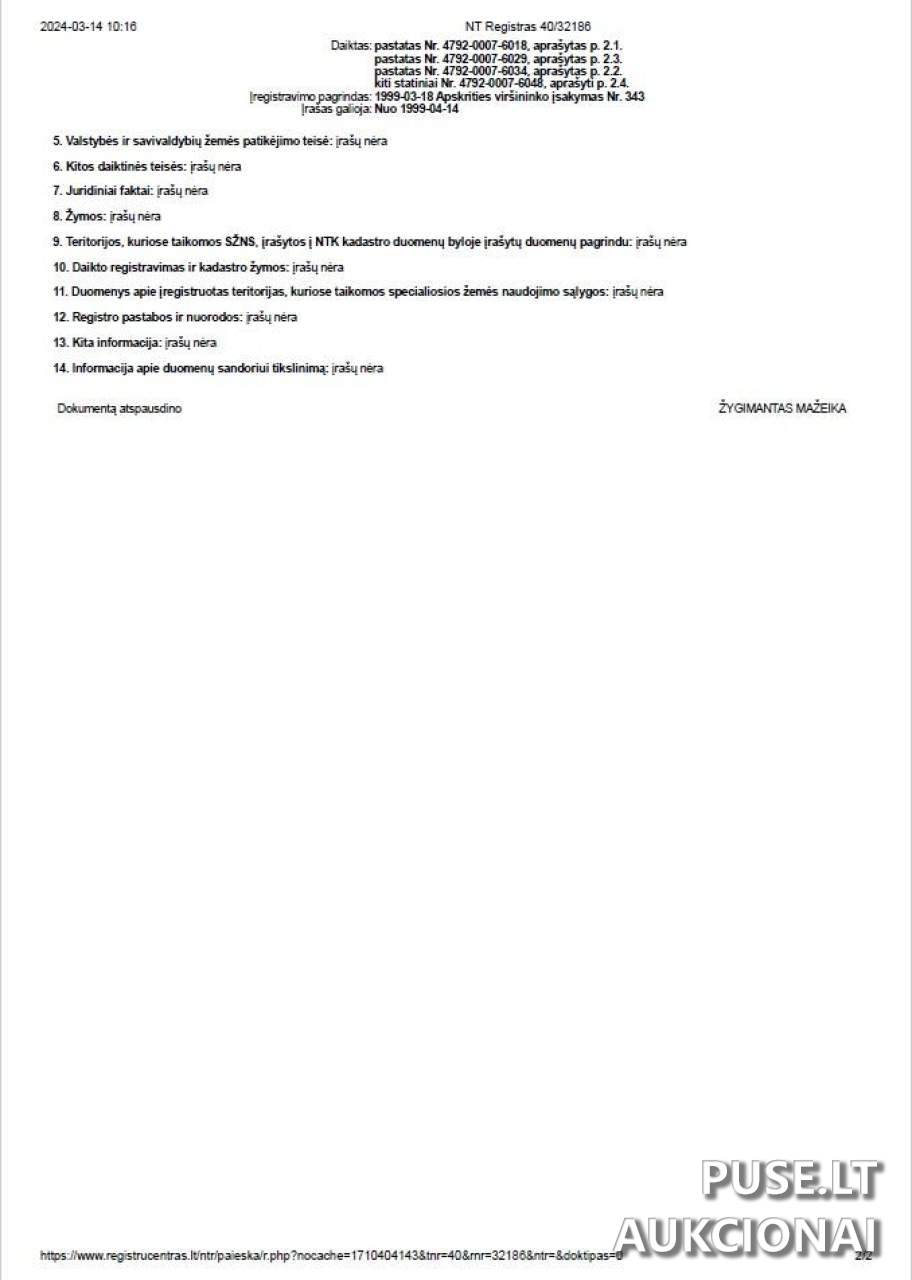 Viešasis aukcionas vyks 2026-02-13 09:00:00 val. ir baigsis 2026-02-17 13:59:59 val. Registracija vykdoma nuo 2026-02-03 00:00:00 iki 2026-02-05 23:59:59. Būtina sumokėti 214 EUR dydžio garantinį mokestį ir 20 EUR registracijos mokestį.
