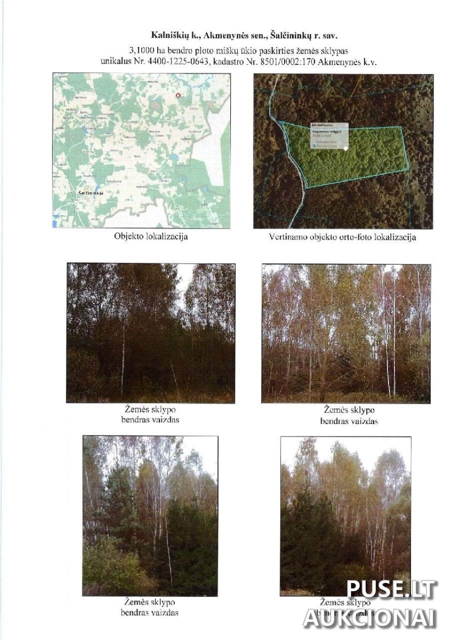 Parduodamas 3,10 hektaro (ha) ploto žemės sklypas su mišku, esantis Šalčininkų rajono savivaldybėje, Kalniškių kaimo teritorijoje. Šis nekilnojamojo turto objektas parduodamas pirmųjų pakartotinių antstolių varžytynių būdu. Būklė yra pradinė, sklypas suformuotas atlikus kadastrinius matavimus.