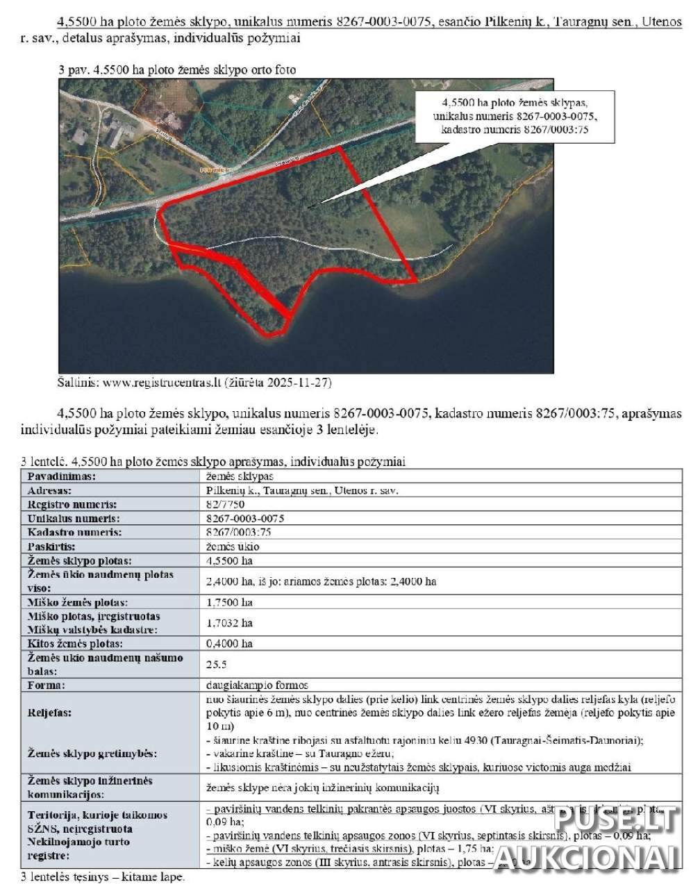 Parduodamas išskirtinio dydžio 4.5500 ha (455 arų) žemės sklypas Utenos rajone, Pilkenių kaime, esantis greta Tauragno ežero. Tai puiki investavimo galimybė, ypač atsižvelgiant į tai, kad apie 400 metrų sklypo pakrantės ribojasi su ežeru. Sklypas yra Aukštaitijos nacionalinio parko teritorijoje, pasižymi natūralia, mažai urbanizuota aplinka, idealia ramybės ieškantiems asmenims ar investuotojams. Iš viso 4.5500 ha žemės ploto, iš jų 1.7033 ha yra įregistruota miško plotas. Žemės ūkio naudmenų našumo balas sklype yra 25.5. Sklypo forma yra daugiakampio formos, o reljefas kintantis: nuo šiaurinės dalies prie kelio reljefas kyla apie 6 metrus link centro, o nuo centrinės dalies link ežero reljefas leidžiasi apie 10 metrų. Sklypas suformuotas atliekant preliminarius matavimus. Jame nėra jokių inžinerinių komunikacijų. Greta sklypo yra asfaltuotas rajoninis kelias 4930 (Tauragnai-Šeimatis-Daunoriai), vakarine kraštine sklypas ribojasi su Tauragno ežeru, o kitomis kraštinėmis su neužstatytais žemės sklypais. Objekto vieta yra rami, Pilkenių kaimas yra nutolęs vos apie 3.9 km nuo seniūnijos centro – Tauragnų miestelio, ir apie 20.5 km nuo Utenos miesto centro. Sklypas parduodamas antstolių varžytynių būdu. Sklypo kadastrinis numeris 8267/0003:75, unikalus Nr. 8267-0003-0075. Viso parduodama 1/1 dalis nuosavybės. Šiuo metu sklybui galioja disponavimo teisių apribojimas – turto areštas. Pirkėjams, norintiems įsigyti žemės ūkio paskirties žemę, taikomi LR Žemės ūkio paskirties žemės įsigijimo įstatymo reikalavimai, reikalaujantys Nacionalinės žemės tarnybos leidimo, nebent bendras turimas žemės ūkio paskirties žemės plotas neviršys 10 ha po sandorio.