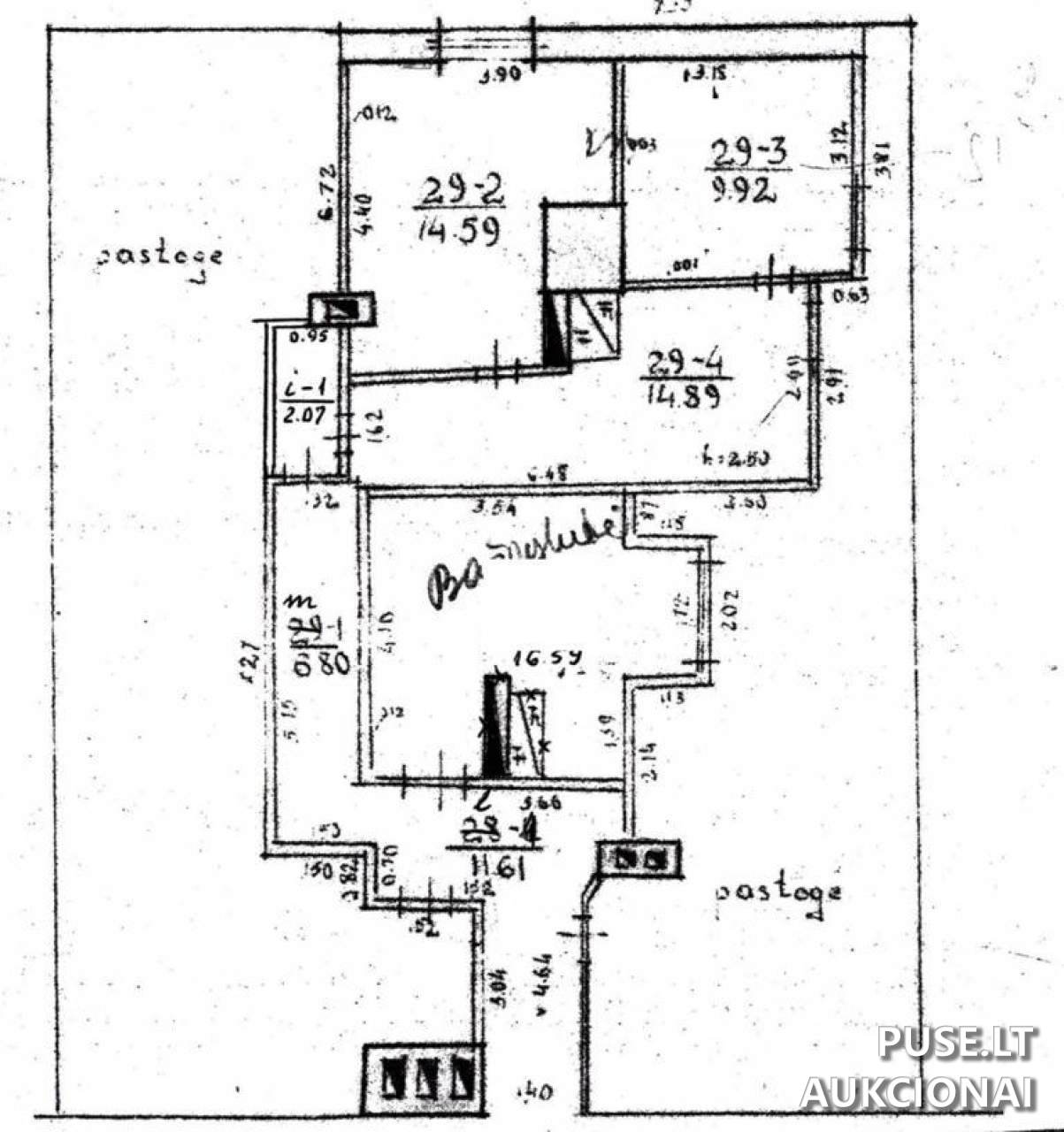 1/2 dalies buto su priklausančiomis bendro naudojimo patalpomis pradinė kaina aukcione yra 14800 EUR.