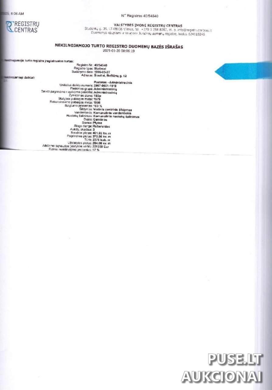 Parduodamas 1/1 dalies administracinės paskirties pastatas Šiaulių mieste, Bačiūnų g. 12, Unikalus Nr. 2997-0001-1019. Pastato baigtumas siekia 100 procentų. Bendras parduodamo objekto plotas yra 481.93 kvadratiniai metrai. Šis nekilnojamasis turtas parduodamas bankroto nemokumo administratorių varžytynėse. PVM objektu nelaikomas. Nekilnojamas turtas yra ant valstybinės žemės sklypo, su kuriuo sudaryta ilgalaikė nuomos sutartis. Pastatas parduodamas kaip vienas turto kompleksas, kartu su ilgalaikiu turtu, nurodytu specialiuose sąrašuose. Svarbu pabrėžti, kad ilgalaikis ir trumpalaikis turtas bei kitas matomas nuotraukose (išskyrus sąraše nurodytą) neparduodamas kartu su nekilnojamuoju turtu.