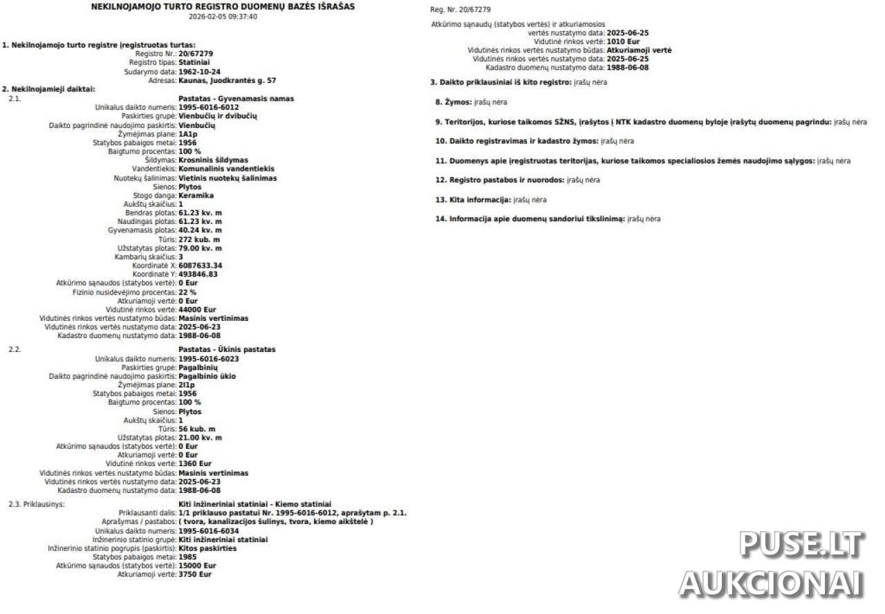 Vykstančios antstolių varžytynės parduoda 1/6 dalį gyvenamojo namo Kauno mieste, Juodkrantės gatvėje 57. Tai puiki investicinė galimybė į nekilnojamąjį turtą Kaune, kurio bendras gyvenamojo namo plotas yra 61.23 kvadratiniai metrai. Būtent parduodama dalis turi unikalų kodą 1/6 ir yra priskiriama pastatų tipui Pirmosios. Nekilnojamojo turto pardavimas vykdomas per antstolių varžytynes. Pradinė šios 1/6 dalies kaina nustatyta 6080 EUR. Aukcionas prasidėjo 2026-02-05 13:51:15 ir baigsis 2026-03-09 13:51:59, suteikiant pakankamai laiko perkančiajam asmeniui pasiruošti ir registruotis dalyvauti aukcione. Turto unikalus numeris viešajame registre yra 1995-6016-6012. Objekto apžiūra organizuojama nurodytu adresu Juodkrantės g. 57, Kaunas. Šiam turtui yra uždėtas turto areštas, kuris bus panaikintas po sėkmingo pardavimo. Būkite informuoti, kad galite įsigyti tik 1/6 nuosavybės dalį, o tai turi būti įvertinta sprendžiant dėl pirkimo ir tolimesnio bendrosios nuosavybės valdymo. Dėl detalių ir dalyvavimo sąlygų kreiptis į organizatorius.