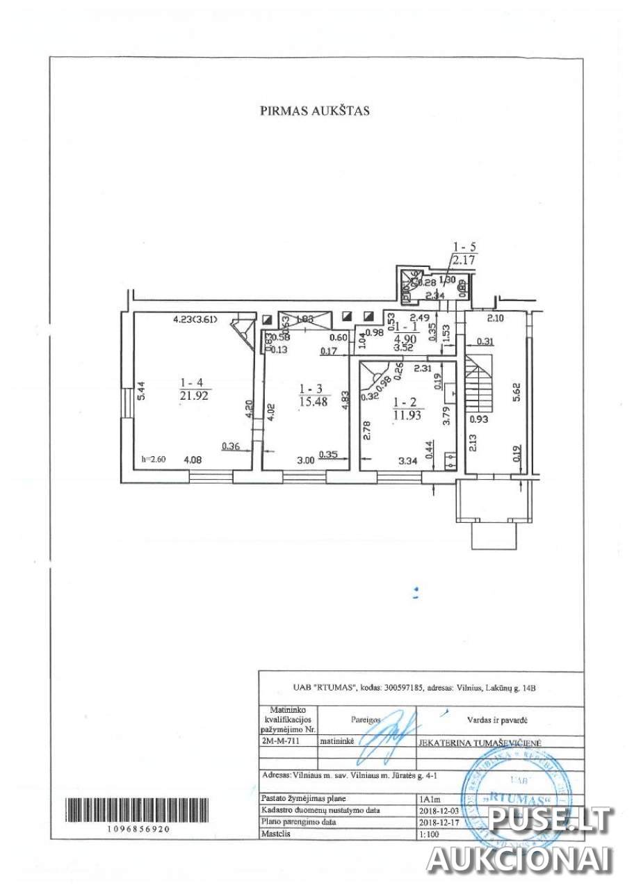 Parduodamas 56,40 kv. m. ploto 1/1 dalis buto (patalpos) Vilniaus mieste, Jūratės g. 4-1, esančio vieno aukšto medinio pastato pirmame aukšte. Pradinė buto kaina aukcione siekia 112050 EUR. Aukcionas vyks 2026-03-30 09:00:00 iki 2026-03-31 13:59:59, o registracija vyksta nuo 2026-03-23 iki 2026-03-25 23:59:59. Prieš dalyvaujant aukcione, privaloma sumokėti 11205 EUR dydžio garantinį mokestį ir 145 EUR registracijos mokestį. Pirkimo-pardavimo sutartis turi būti pasirašoma per 30 dienų nuo aukciono, o visa kaina sumokama per 10 dienų po sutarties pasirašymo.