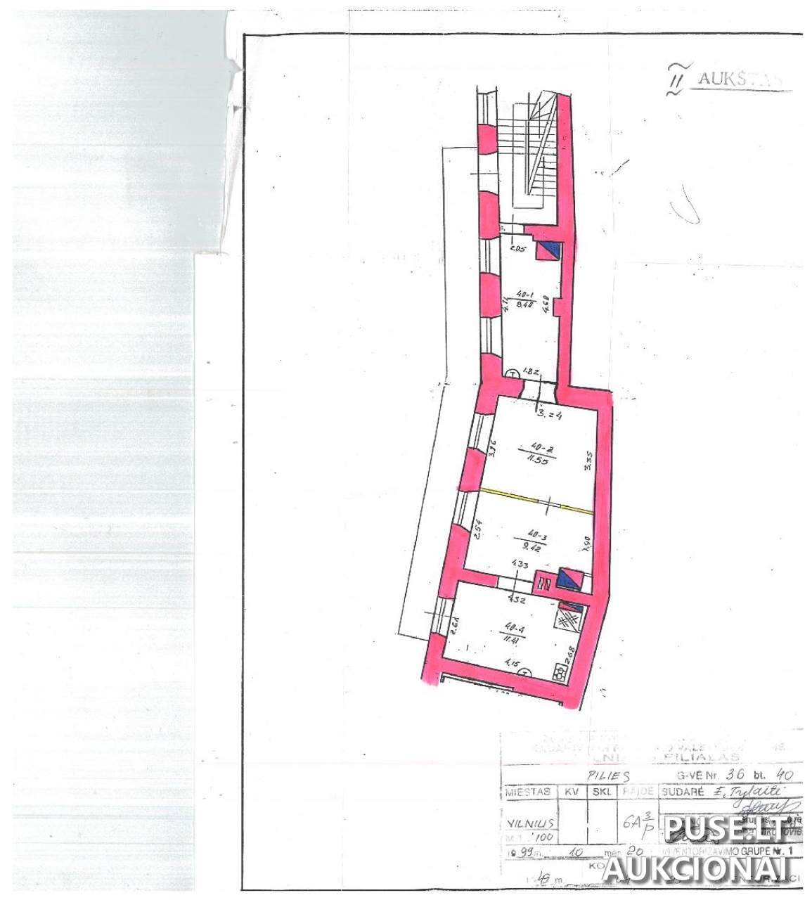Parduodamas 1/1 dalis nekilnojamojo turto objekte, esančiame Vilniaus m. savivaldybėje, Pilies g. 36-40. Tai yra 40.78 kv. m bendrojo ploto patalpos, esančios trijų aukštų mūrinio pastato antrame aukšte. Unikalus objekto kodas – 1094-0284-6052:0002. Patalpos parduodamos esamos fizinės ir funkcinės būklės, kadastro duomenys gali neatitikti faktinės situacijos.