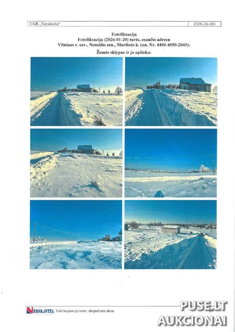 Sklypas yra suformuotas atliekant kadastrinius matavimus, jo forma artima stačiakampiui, reljefas sąlyginai lygus. Privažiavimas galimas žvyro keliu, o maždaug 3 km atstumu yra magistralinis kelias A3. Komunikacijos sklype neprieinamos, tvora nėra įrengta. Pažymėtina, kad apžiūros dieną sklypas buvo padengtas storu sniego sluoksniu ir yra neužstatytas, suformuotas šalia namų valdos.