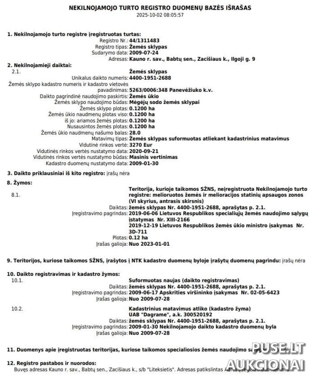 Jordono ir unikalus numeriai, reikalingi detalesnei patikrai: Kadastro Nr. 5263/0006:348, Unikalus Nr. 4400-1951-2688. Turto apžiūra galima vietoje, adrese Ilgoji g. 9, Zacišiaus k., Babtų sen., Kauno r. sav.