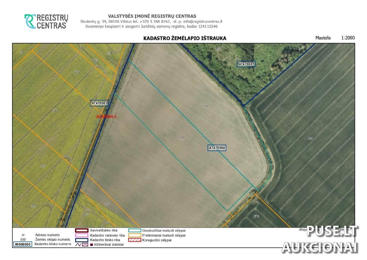Kadastro numeris: 4747/0004:122, Unikalus numeris: 4747-0004-0122. Turto pardavimas vyksta per antstolių varžytynes, kurioms vadovauja antstolė Doloreša Petronaitienė. Pirkėjams, planuojantiems įsigyti žemės ūkio paskirties žemę, taikomi specialūs reikalavimai, nurodyti Lietuvos Respublikos žemės ūkio paskirties žemės įsigijimo įstatyme – gali tekti pateikti dokumentus, patvirtinančius teisę įsigyti šį turtą.