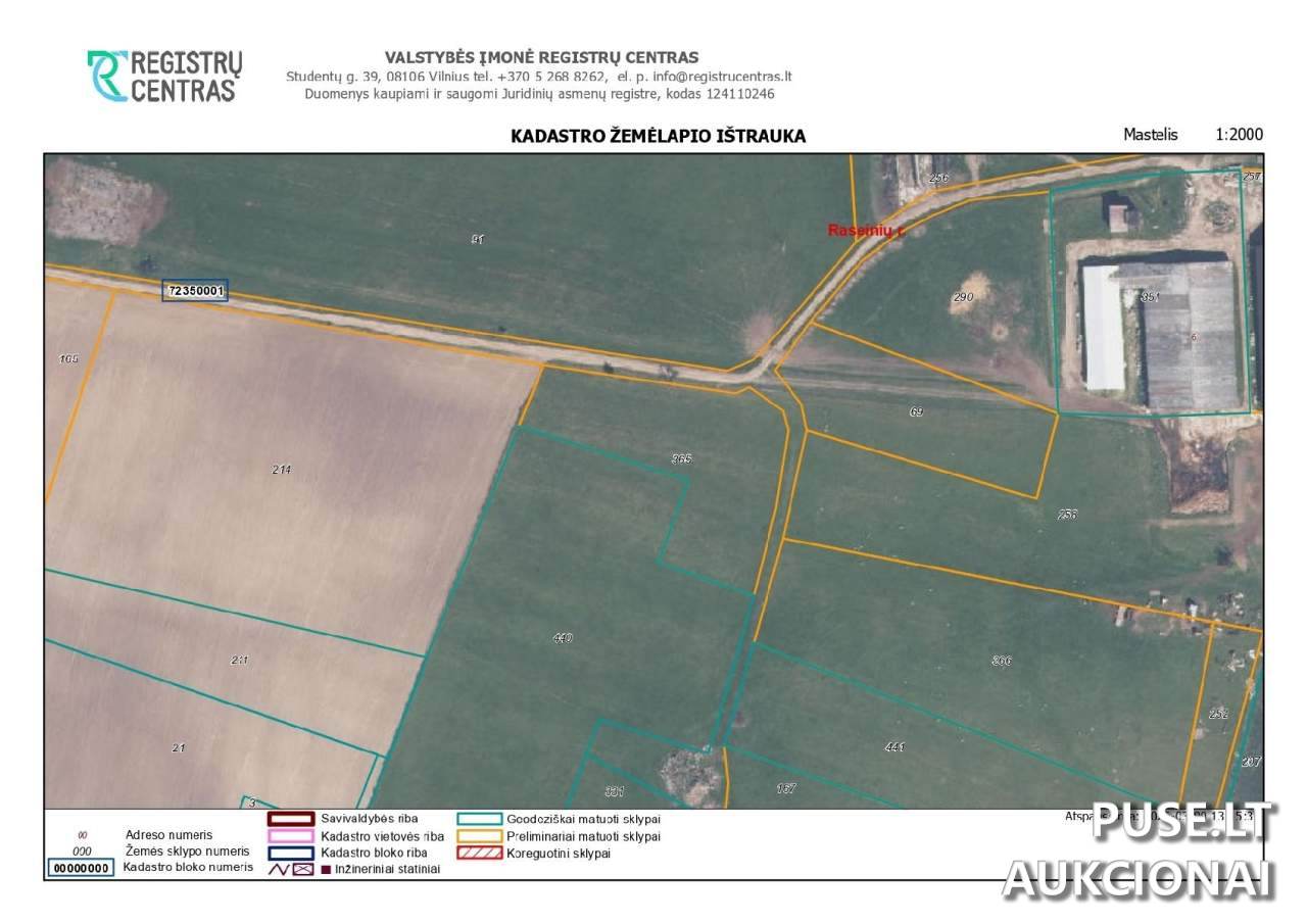 Viso žemės sklypo unikalus numeris yra 4400-1567-0589, o kadastro numeris – 7235/0001:365 (Milašaičių k.v.). Svarbu atkreipti dėmesį, kad parduodama dalis yra vis dar su turto areštu – disponavimo teisės apribojimas yra taikomas.