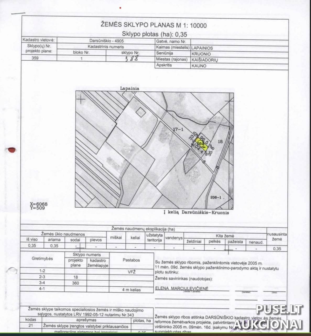 Parduodamas 0.3500 ha žemės ūkio paskirties žemės sklypas antstolių varžytynėse Lapainių kaimo teritorijoje, Kaišiadorių rajono savivaldybėje. Sklypo pagrindinė naudojimo paskirtis yra Žemės ūkio, o naudojimo būdas nurodytas kaip Kiti žemės ūkio paskirties žemės sklypai. Visas parduodamas plotas, 0.3500 ha, yra priskiriamas žemės ūkio naudmenoms, iš kurių ariamos žemės plotas sudaro 0.3500 ha. Taip pat nurodoma, kad nusausintos žemės plotas yra 0.3500 ha. Varžytynėse parduodamas ir šalia esantis identiško ploto sklypas.