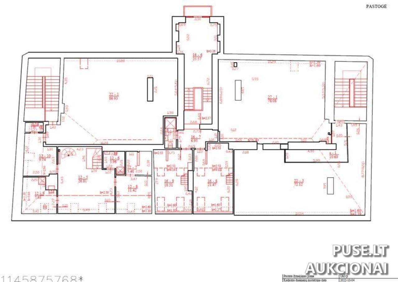 Kadastro duomenys nustatyti 2002-02-28 (nurodoma, kad palėpė performuota atidalinant dvi patalpas). Yra apribojimų dėl apžiūros ir bendraturčių susitarimų trūkumo tvarkos klausimais. Pastato aukšto plane (duomenys iš 2022-10-04) patalpos indeksais Nr. 12 ir Nr. 27 yra atidalintos, o patalpos Nr. 16 faktiškai naudojamos trečiųjų asmenų, neturint su jais sudarytų naudojimosi susitarimų.