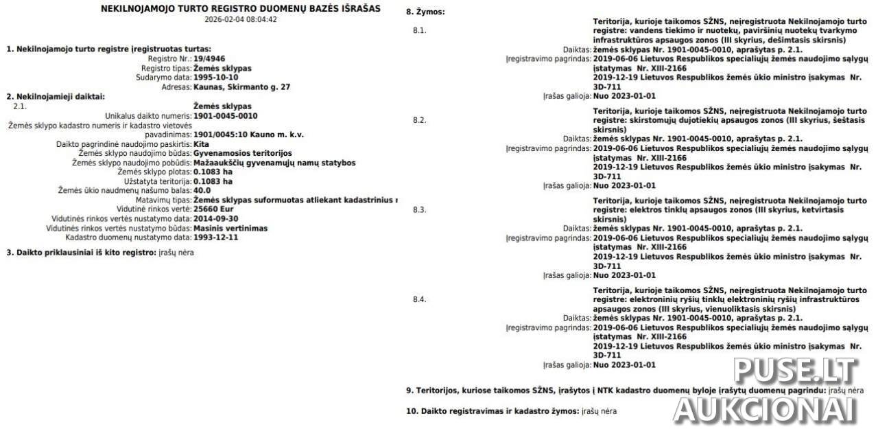 Juridinė informacija apie sklypą: Kadastro numeris yra 1901/0045:10, o Unikalus numeris – 1901-0045-0010. Pardavėjas - juridiniai asmenys ar privačių asmenų bendrosavininkai, kurių atstovas yra antstolis. Varžytynes organizuoja Antstolio M.Petrovskio kontora, įsikūrusi A. Mickevičiaus g. 56-18, LT-44244 Kaunas.