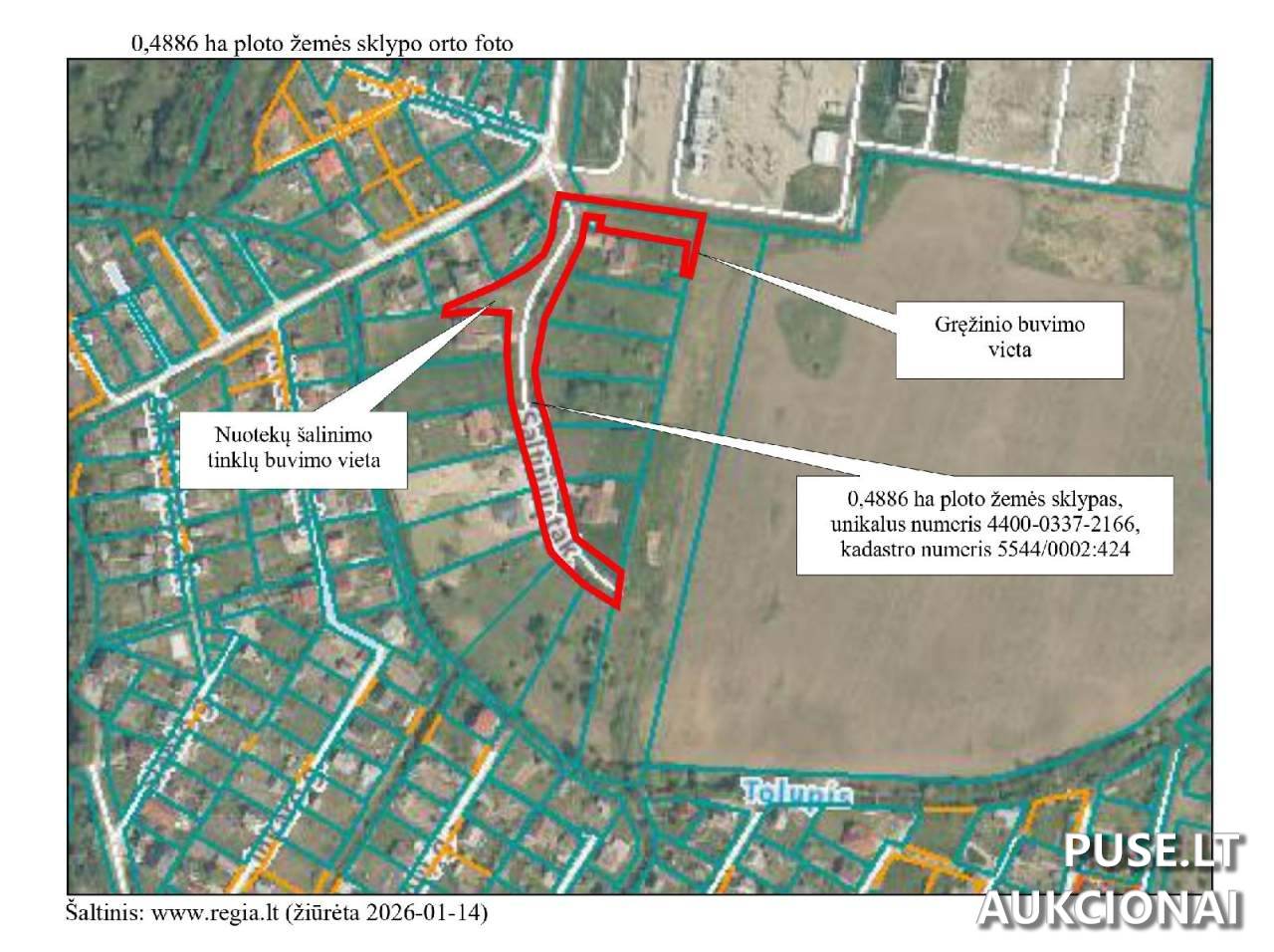 Inžineriniai tinklai: vakarinėje sklypo dalyje įrengti nuotekų šalinimo tinklai, o šiaurės rytinėje dalyje – gręžinys. Sklypo kadastro numeris yra 5544/0002:424, unikalus numeris 4400-0337-2166. Pardavimą vykdo antstolė Brigita Tamkevičienė. Objektui taikomas hipotekos nutartis apribojimas.