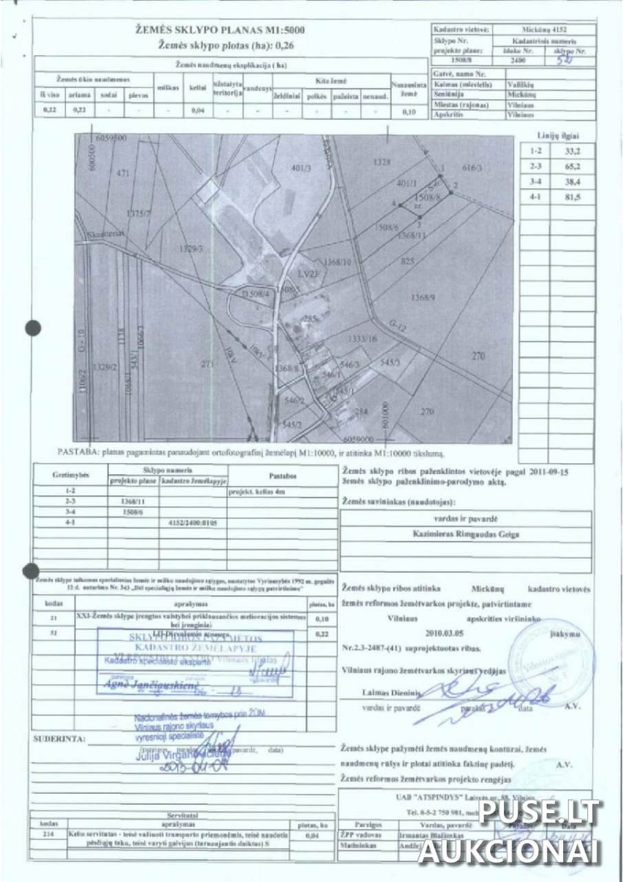 Parduodama 1/3 nekilnojamojo turto – žemės sklypo – dalis antstolių varžytynėse Vilniaus rajono savivaldybėje, Vališkių kaime. Objekto tipas yra antrosios kategorijos sklypai. Pradinė šio turto pardavimo kaina aukcione yra nustatyta 491 EUR. Aukcionas prasideda 2026-04-01 09:27:21 ir baigiasi 2026-05-04 09:27:59. Kadastrinis numeris 4152/2400:52, Unikalus numeris 4400-2655-4123. Šiuo metu turtas yra areštuotas. Jeigu varžytynėse perduodama žemės ūkio ar miškų ūkio paskirties žemė arba akcijų (teisių, pajaus) dalis juridiniam asmeniui, kuris nuosavybės teise valdo didelius žemės ūkio ar miškų ūkio ploto kiekius (kaip nurodyta Žemės ūkio paskirties žemės įsigijimo įstatyme ar Miškų įstatyme), potencialūs pirkėjai privalo iki turto pardavimo dienos pateikti antstoliui duomenis ir dokumentus, patvirtinančius atitikimą įgijėjui keliamiems reikalavimams. Objektui atstovauja Antstolių G.Puodžiuko ir A.Puodžiukienės kontora, vykdanti antstolė Aurelija Puodžiukienė. Pardavimo procesas vyksta dalyvaujant privačiam asmeniui kaip skolininkui. Dėl turto apžiūros informacijos nėra pateikta.