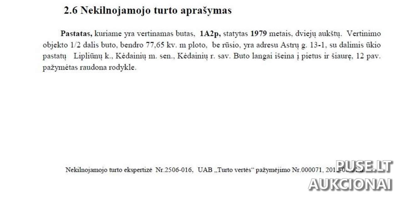 Turto charakteristikos ir detalesnė informacija, įskaitant vizualinę medžiagą, pateikta nuotraukose Foto1, Foto2 ir Foto3. Konkrečios buto charakteristikos (plotas, kambarių skaičius, būklė) privalės būti patikslintos per turto apžiūrą arba peržiūrint pridedamą dokumentaciją.