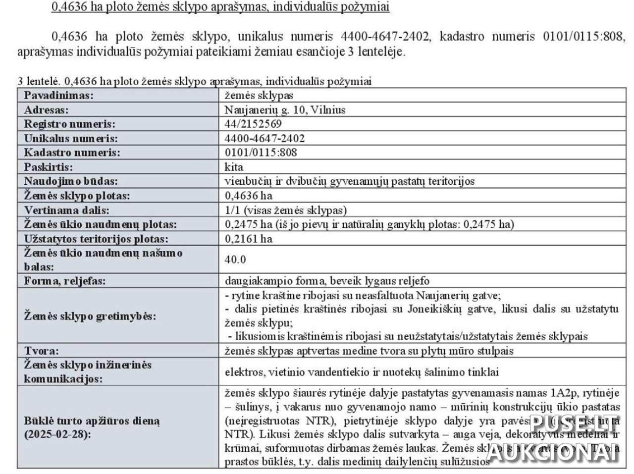 Parduodamas 0,4636 ha ploto žemės sklypas Vilniaus mieste, Naujanerių g. 10, antstolių varžytynėse. Pradinė pardavimo kaina – 140 680 EUR. Sklypo pagrindinis naudojimo būdas yra vienbučių ir dvibučių gyvenamųjų pastatų teritorijos. Šis objektas yra 1/1 dalis visos nuosavybės.