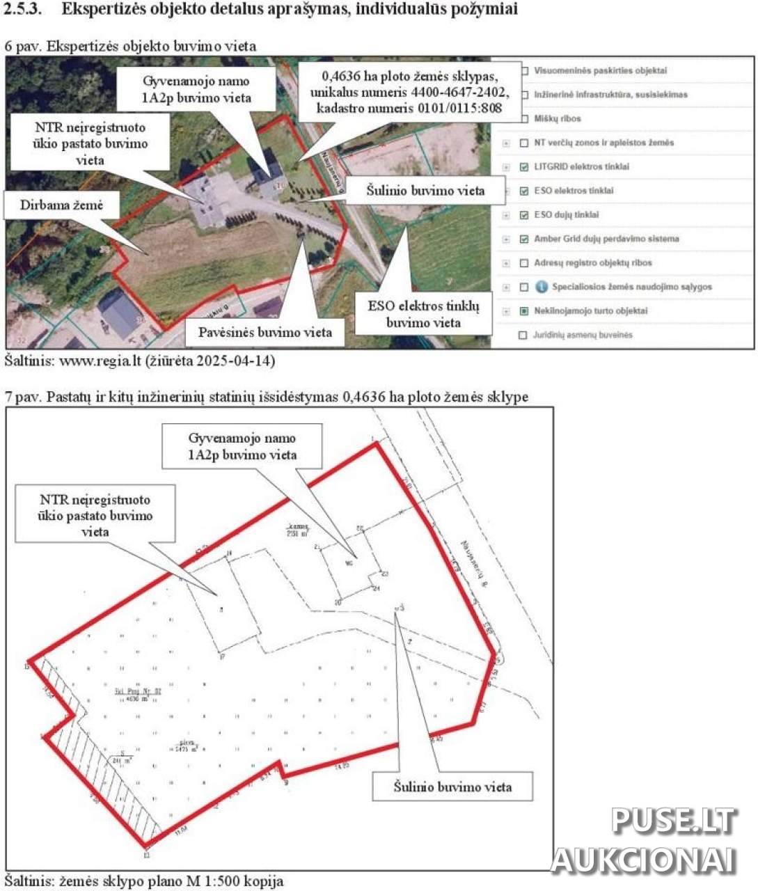 Bendras sklypo plotas yra 0,4636 ha, iš kurio 0,2475 ha sudaro žemės ūkio naudmenos (pievos ir natūralios ganyklos), o 0,2161 ha yra užstatyta teritorija. Žemės ūkio naudmenų našumo balas yra 40,0. Sklypas yra daugiakampio formos, beveik lygaus reljefo. Kadastrinis numeris 0101/0115:808, unikalus numeris 4400-4647-2402.