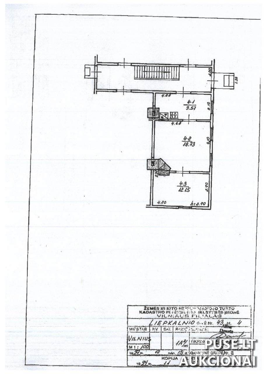 Parduodamas 1/1 dalies nuosavybės teisė priklausanti 40,45 kv. m. ploto svetainė/butas, esantis dviejų aukštų medinio pastato pirmame aukšte, Liepkalnio g. 43-4, Vilniuje. Šis nekilnojamasis turtas parduodamas viešame savivaldybės aukcione su 31500 EUR pradine kaina. Unikalus nekilnojamojo daikto, kurio pagrindinis naudojimo tipas yra Patalpos/Butai, kadastre yra 1094-0195-4010:0012.