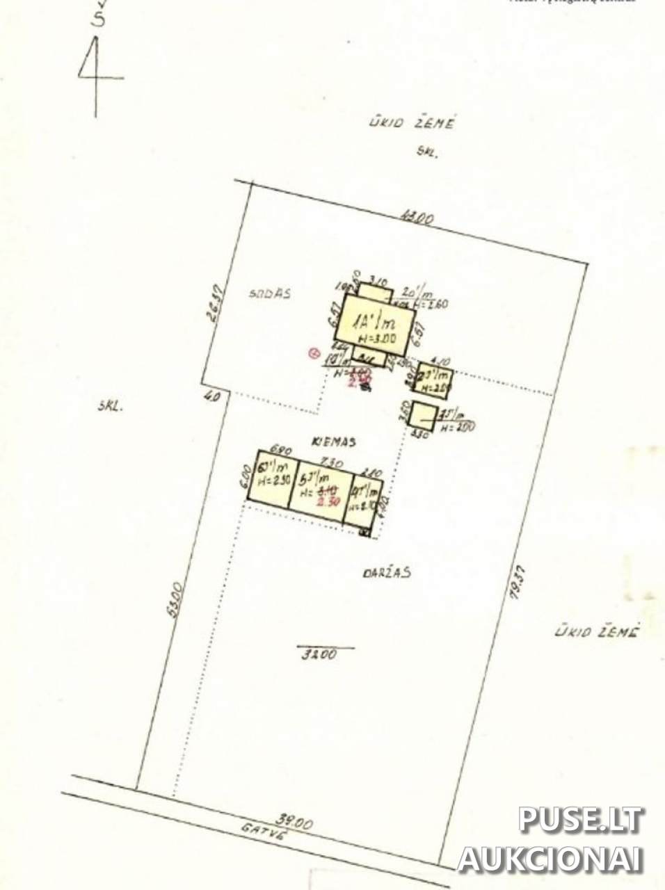 Parduodamas namas (65,63 kv. m) ir ūkiniai statiniai: Garažas (15,99 kv. m), Viralinė (11,88 kv. m), Malkinė (16,80 kv. m), Tvartas (43,80 kv. m), Daržinė (28,91 kv. m) bei Kiemo statiniai (Šulinys, lauko tualetas, kanalizacijos šulinys).
