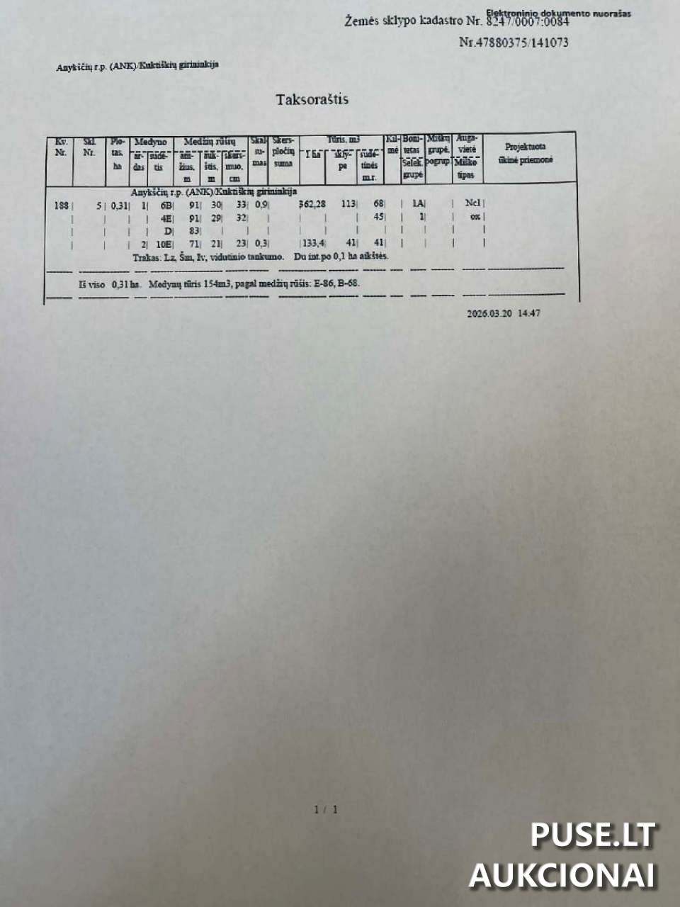 Paskirtis yra Miškų ūkio (ūkinių miškų sklypai), bendras plotas 0.3100 ha, iš kurių miško žemės plotas siekia 0.3058 ha.