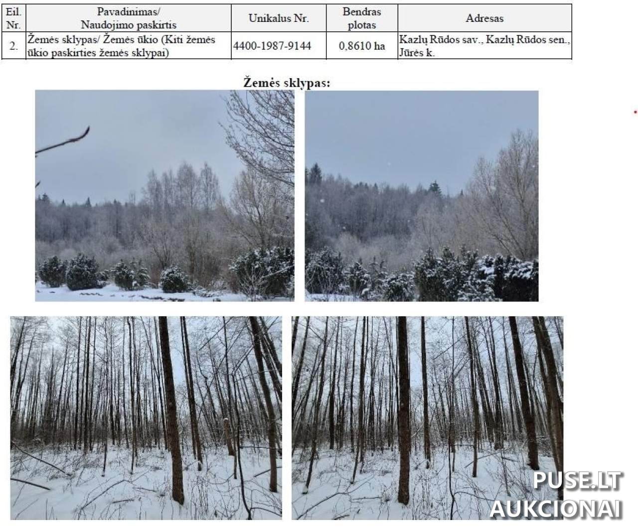 Parduodamas 0,8610 ha ploto žemės ūkio paskirties žemės sklypas Jūrės kaime, Kazlų Rūdos seniūnijoje, Kazlų Rūdos savivaldybėje, parduodamas per antstolio varžytynes. Šis parduodamas turtas yra 1/1 nuosavybės dalis. Sklypo unikalių ir kadastro numeriai leis tiksliai identifikuoti objektą viešuose registruose: Kadastro Nr. 5128/0005:251, Unikalus Nr. 4400-1987-9144. Pradinė pardavimo kaina yra 3680 EUR. Aukcionas vyks internetu, jo pradžia numatyta 2026-04-21 13:17:11, o pabaiga - 2026-05-21 13:17:59. Varžytynėse gali dalyvauti tik tie asmenys, kurie atitinka teisės aktų nustatytus reikalavimus ar turi reikiamus leidimus įgyti šį turtą. Laimėtojas privalės antstoliui pateikti dokumentus, patvirtinančius teisę įsigyti turtą, vadovaujantis Sprendimų vykdymo instrukcijos 86, 87 ir/arba 88 punktais. Turtas yra su hipoteka. Turto apžiūra šiuo metu nėra nurodoma.