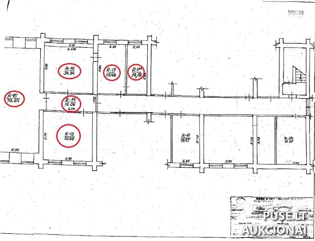 Komunikacijos: Centrinis šildymas iš centralizuotų sistemų, komunalinis vandentiekis, komunalinis nuotekų šalinimas, gamtinės dujos. Ši parduodama dalis yra neatsiejama bendro objekto dalis, kurio bendras plotas yra 187,66 kv. m. Bendras plotas, suformuotas iš patalpų, pažymėtų indeksais R-13 (33,98 kv.m.), R-14 (12,06 kv.m.), R-15 (73,64 kv.m.), R-16 (34,34 kv. m.), R-17 (19,46 kv.m.), R-17A (14,18 kv.m.) ir kitų rūsio patalpų, esančių tąsčiame pastate.