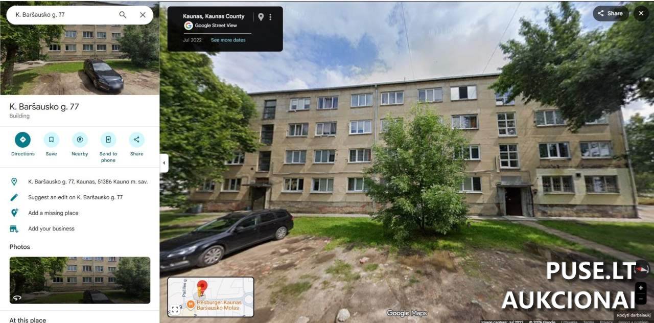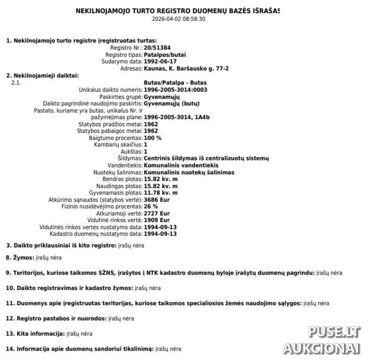 Parduodamas nekiltasis turtas Kauno mieste, K. Baršausko gatvėje 77-2, Antstolių varžytynių būdu. Tai 1/2 dalis gyvenamojo ploto, tinkama pradiniam investiciniam įvertinimui. Objekto bendras plotas siekia 15.82 kvadratinio metro. Butas yra pirmame aukšte, o namas statytas 1962 metais.