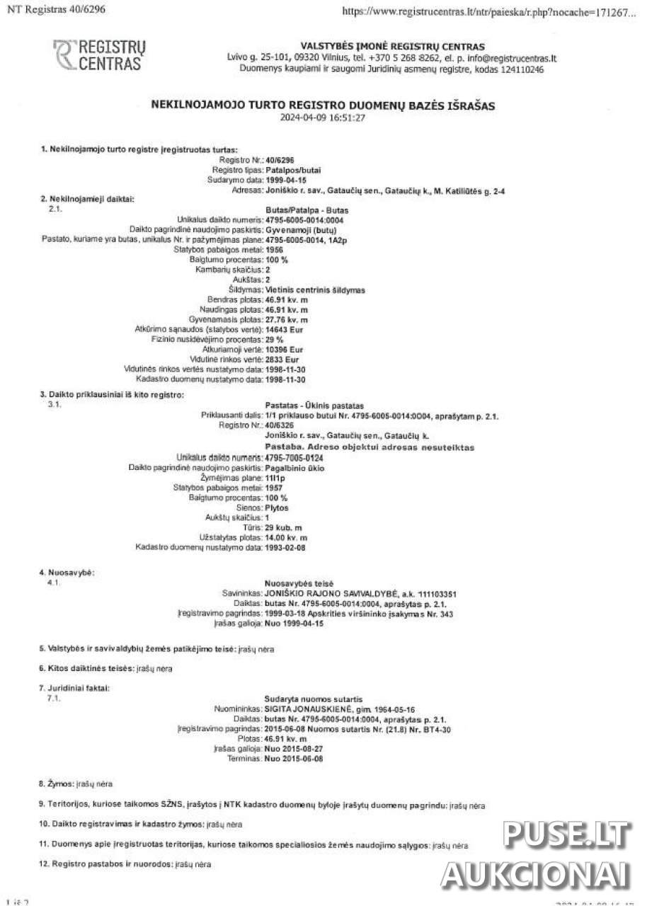 Nekilnojamojo turto unikalus numeris yra 4795-6005-0014:0004, o bendras buto plotas – 46,91 kv. m. Taip pat parduodamas ūkinis pastatas.