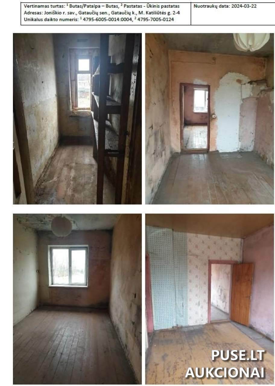 Parduodamos 1/1 dalies patalpos-butas Joniškio rajono savivaldybėje, Gataučių kaimo Gataučių seniūnijoje, adresu M. Katiliūtės g. 2-4. Tai yra pakartotinis savivaldybės aukcionas. Buto bendras plotas yra 46,91 kvadratinio metro. Pastatytas 1956 metais. Prie buto priskiriamas ir pastatas-ūkinis pastatas, kurio užstatytas plotas 14,00 kv. m, statybos metai 1957. Unikalus šio buto numeris – 4795-6005-0014:0004. Svarbu pažymėti, kad žemės sklypas su šiuo objektu nėra suformuotas. Patalpos-butas (inventoriaus Nr. 101033) plane žymimas kaip 1A2p, o ūkinis pastatas – 11I1p.