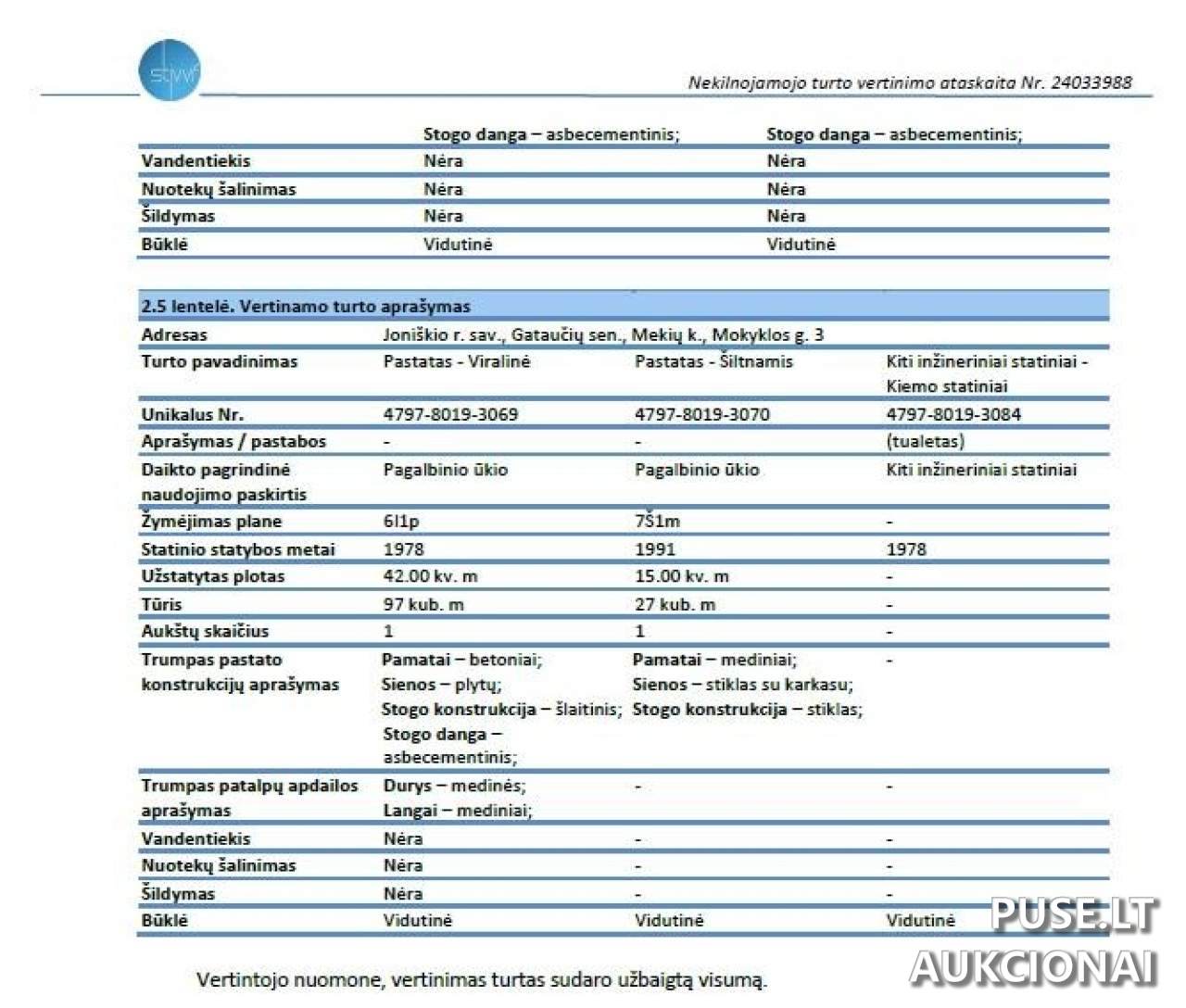 Pagrindinis objektas yra gyvenamasis namas (unikalus Nr. 4797-8019-3014), kurio bendras plotas yra 88,48 kv. m. Taip pat parduodamas ūkinis pastatas (unikalus Nr. 4797-8019-3025) su 64,00 kv. m užstatytu plotu, keturi sandėliai (su užstatytais ploto deriniais 18,00 kv. m, 18,00 kv. m ir 12,00 kv. m), viralinė (42,00 kv. m užstatytas plotas) ir šiltnamis (15,00 kv. m užstatytas plotas). Parduodami ir kiemo statiniai (unikalus Nr. 4797-8019-3084).