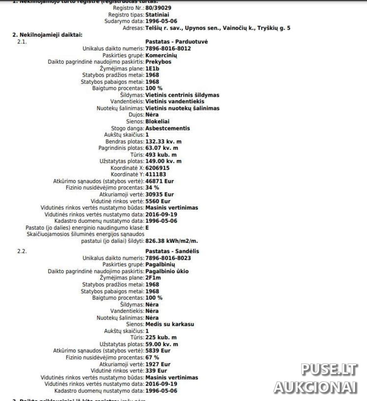 Parduotuvės pastato Telšių r. sav., Vainočių k., Tryškių g. 5, pradinė kaina yra 12600 EUR.