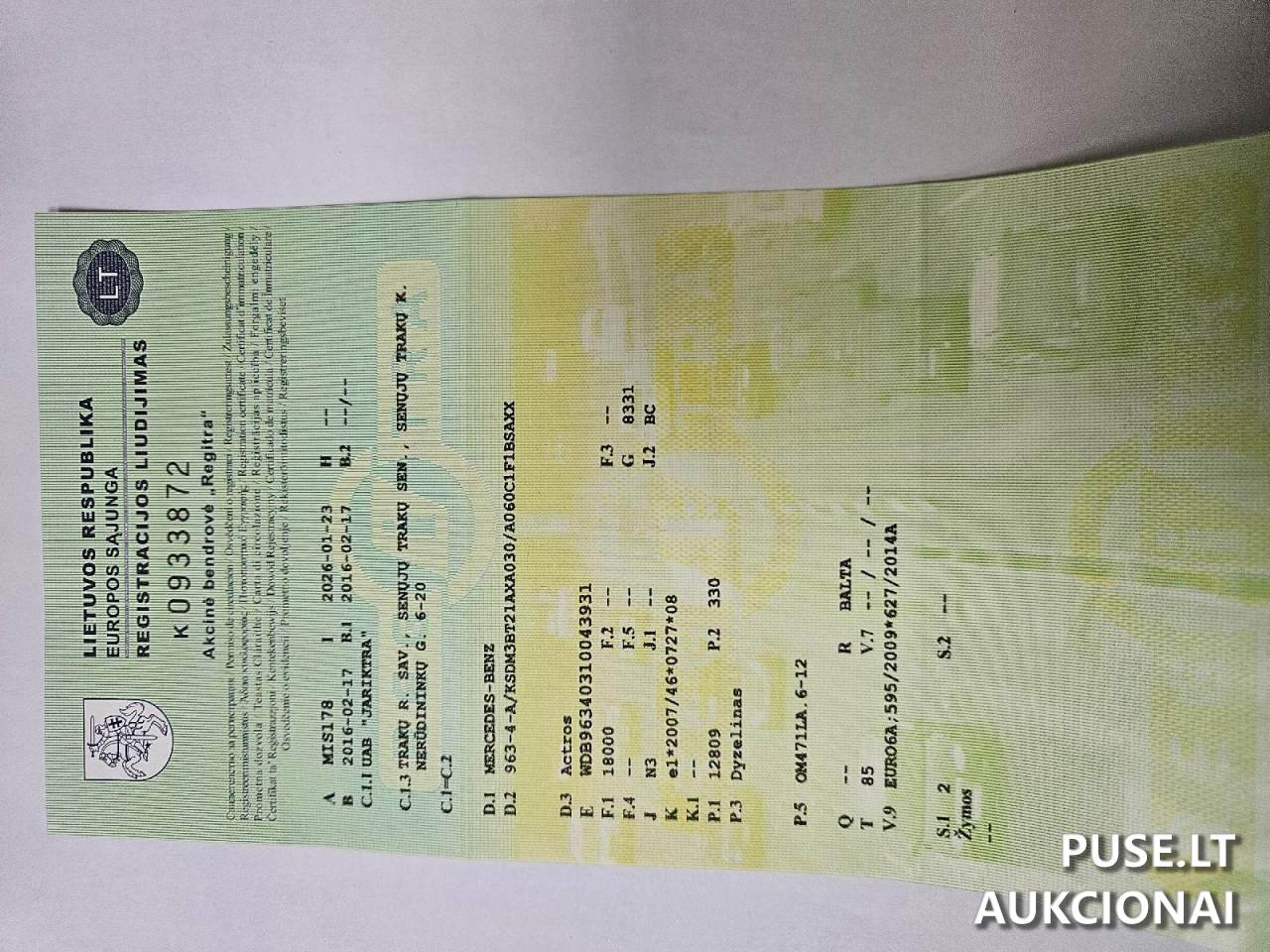 A Mercedes-Benz Actros cargo truck is available for auction with a starting price of 12000 EUR. Registered on 2016-02-17, this vehicle falls under category N3 and features a diesel engine with a manual gearbox. The body type is a van in white color.