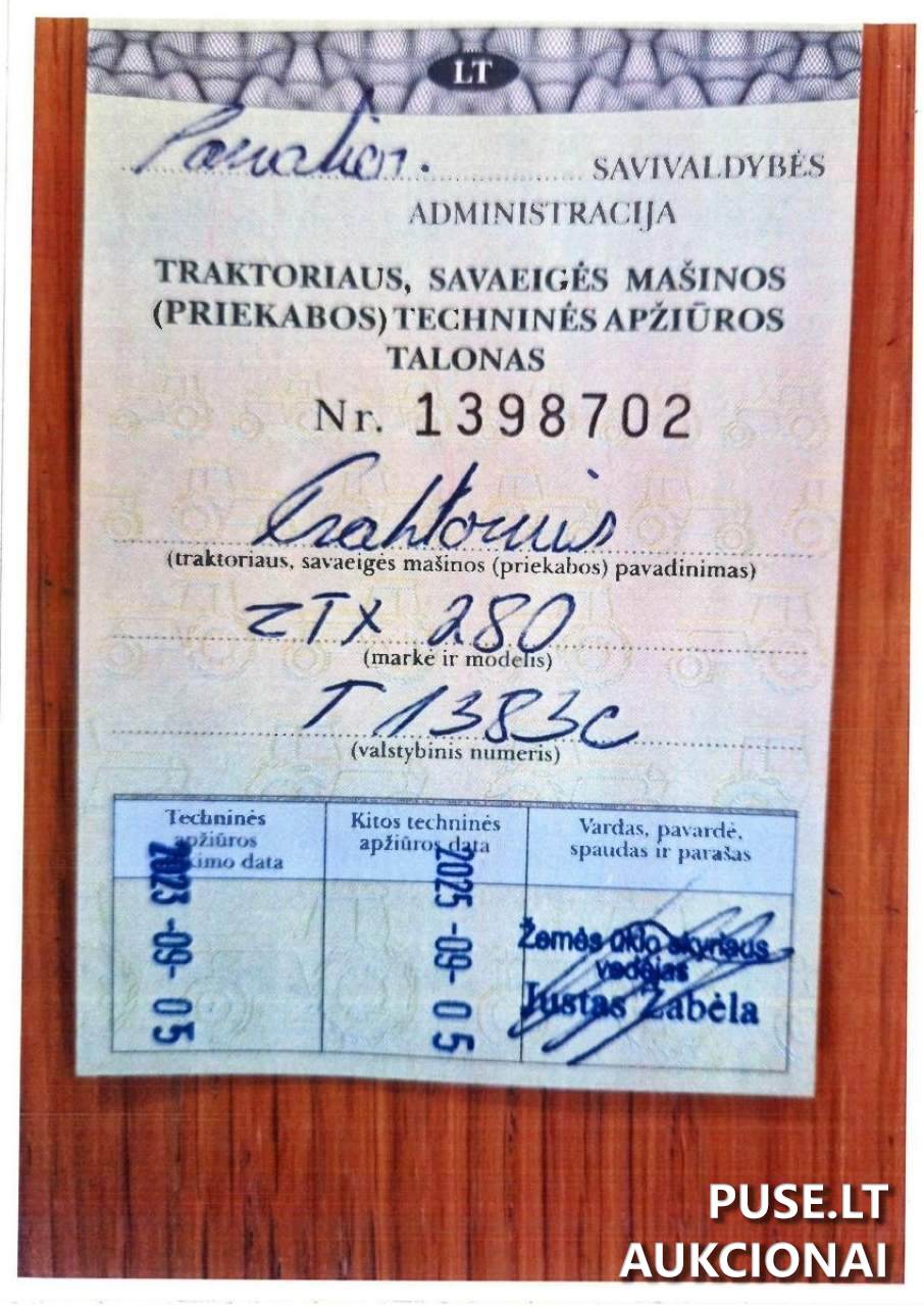 The tractor's identification code is 5000624079, and the registration certificate number is 0383949. The vehicle identification number (VIN) is ZT28AC4JJE3380179. The tractor has a maximum permissible mass of 10000 kg and an engine power of 208.80 kW. It was first registered in Lithuania on March 31, 2020, although its initial registration took place on January 23, 2006.