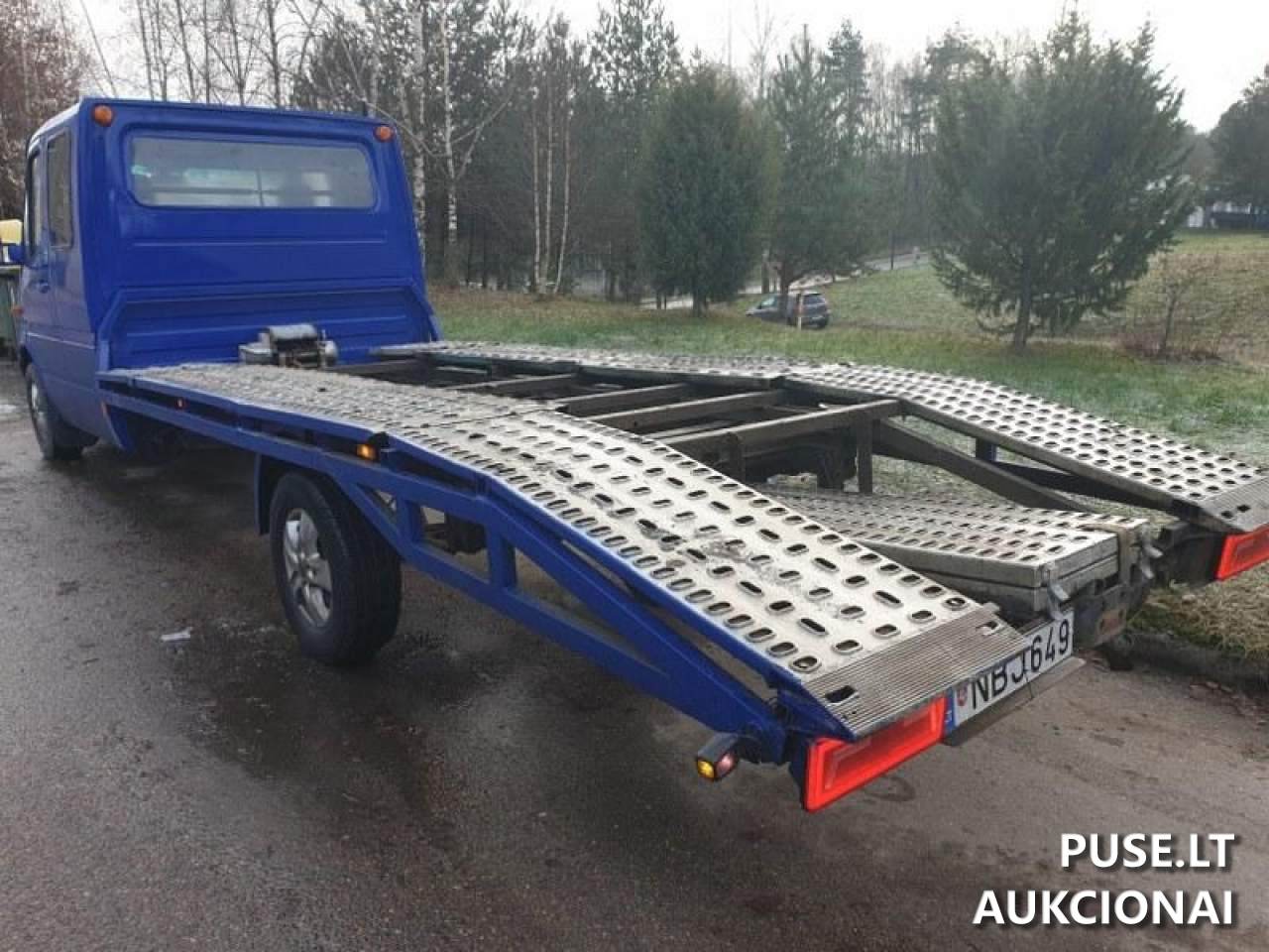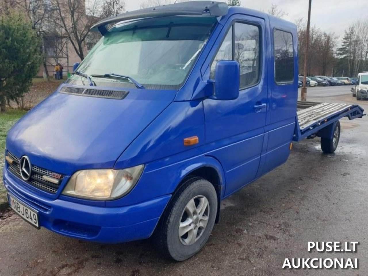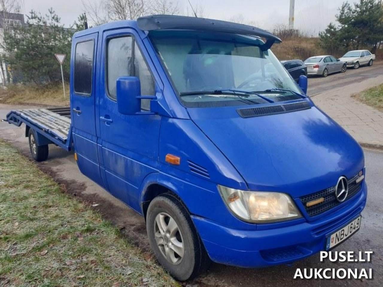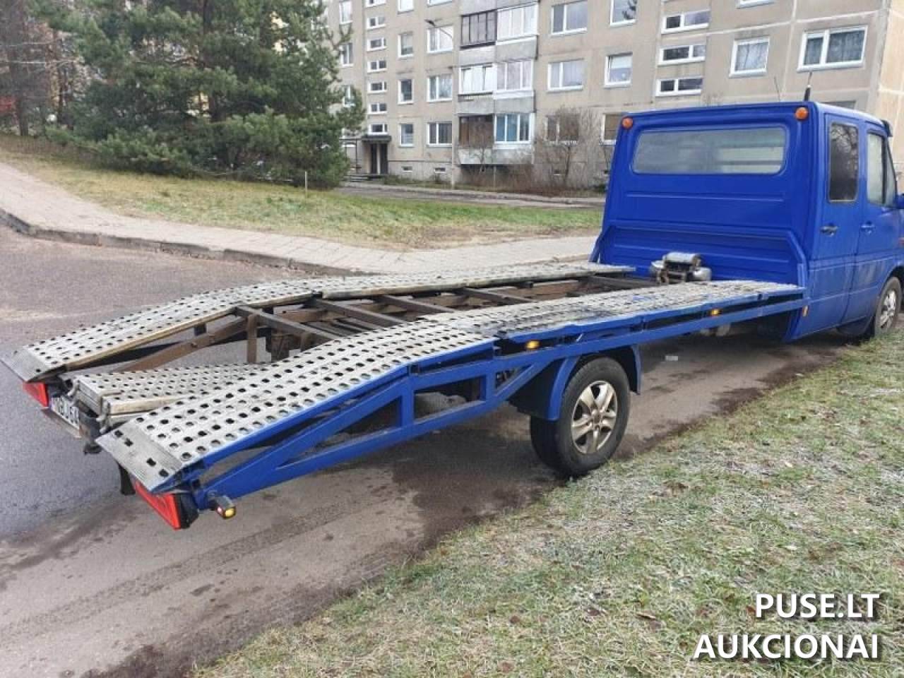 A used MERCEDES BENZ SPRINTER 313CDI tilt truck is available for sale via public auction with a starting bid of 700 EUR. This vehicle is equipped with a 12000lb electric winch. It was manufactured in August 2000, runs on Diesel fuel, has an engine displacement of 2151 cm cubic, and produces 95 kW of engine power. The mileage is 456000 kilometers. The technical inspection is valid until 2026-09-30. The total mass is 3500 kg, and the curb weight is 2150 kg.