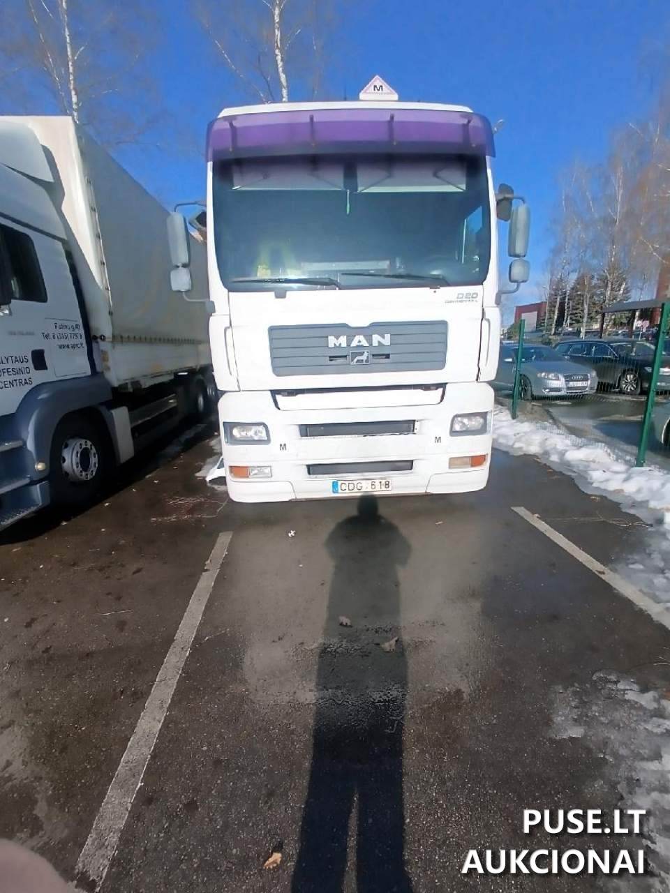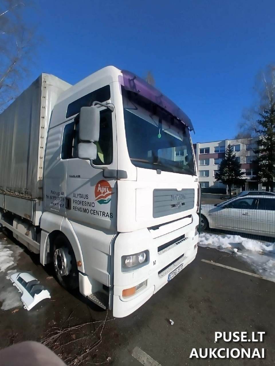 A used 2006 MAN TGA26.430 truck tractor is being sold via a resale auction in Alytus. This heavy-duty vehicle falls into the category of trucks weighing over 3.5t up to 12t. The total engine power measures 316 kW from a 10518 cm³ displacement. The odometer reads 726,223 km. Noted defects include an expired technical inspection on 2026-01-21 and visible rust on the front driver's side door. The legal identifier code is CDG618. This auction is organized and managed by the Alytus Vocational Training Centre.