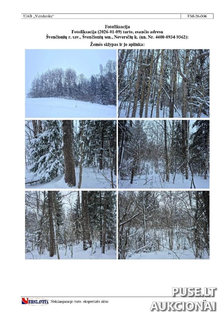 A parcel of land designated for forestry is being sold in Neversčiai village, within the Švenčionys District Municipality. This is a Class II plot, sold in its entirety (1/1 share). The total starting bid at auction is 7020 EUR. The immovable property unique number is 4400-0934-9362, and the cadastral number is 8667/0003:194. The main purpose of the plot is Forestry, specifically designated as Protected Forest Lands. The auction opens on 2026-04-23 11:59:59 and closes on 2026-05-25 11:59:59. This property is currently under arrest. Participants must comply with legal requirements or hold necessary permits to acquire land plots. The winning bidder must present documents confirming their right to acquire the property, following points 86-88 of the Enforcement Proceedings Instruction. A detailed property appraisal report is available for review at the Office of Enforcement Officer Vitalis Milevičius.