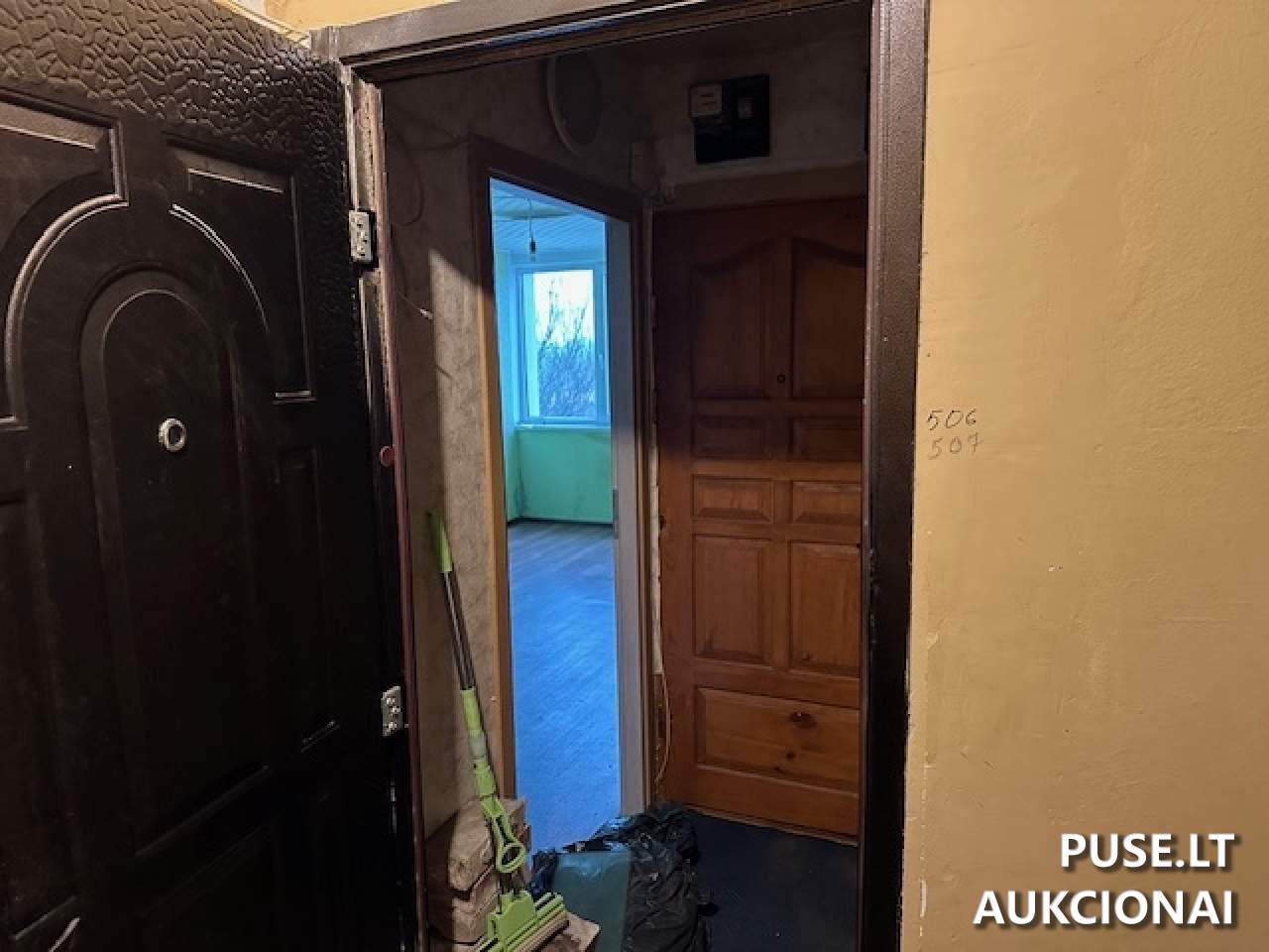 A compact one-room apartment is being sold via public auction in Siauliai, located at Gumbinės g. 114-506. The total area is 19.72 sqm, with an additional 5.70 sqm of common areas. The unit, designated 1N5p on the plan, is on the fifth floor of a residential building. It is situated within a shared block with another non-municipality apartment, sharing corridor, toilet facilities, and common entrance doors.
